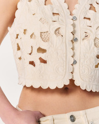 Flower power. A laid-back, slightly cropped vest with ‘60s vibes. Featuring delicate floral embroidery, laser-cut detailing, and softly scalloped edges. It's crafted from Lightweight Rigid non-stretch denim that provides structure, but breaks in over time for a soft and comfortable feel. In Ecru, a soft, warm white. Size & Fit • Relaxed fit, hits at the waist • Fits true to size • Size Small : body length 18.25" | back length 16.75" | chest 35.75" • Model is 5'11" wearing size small Features & Details • 100% cotton • Signature metal 4-hole buttons • Button closure • Hand wash • Imported Product ID: WDD25PA004RGEC