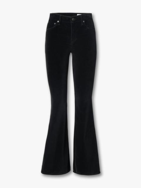 The Dahlia. Our mid-rise full-length jeans that are fitted through the thighs before gradually loosening into wide, flared hems. Crafted from our Flexi velvet that smooths, sculpts, and stretches for a luxuriously perfect fit. Perfect for building effortlessly festive, holiday outfits. In Black. Size & Fit • Fits true to size • Size 26: 10.5" rise, 33" inseam, 22" leg opening • Model is 5'9" wearing size 24 Features & Details • 96% cotton, 4% elastane • Flexi Velvet in Black • Zip fly with a button closure • Signature dagger button & rivets • Branded paper patch • Five-pocket silhouette • Machine wash cold inside out on delicate & lay flat to dry • Color may transfer • Imported Product ID: RJ1925H1XBV