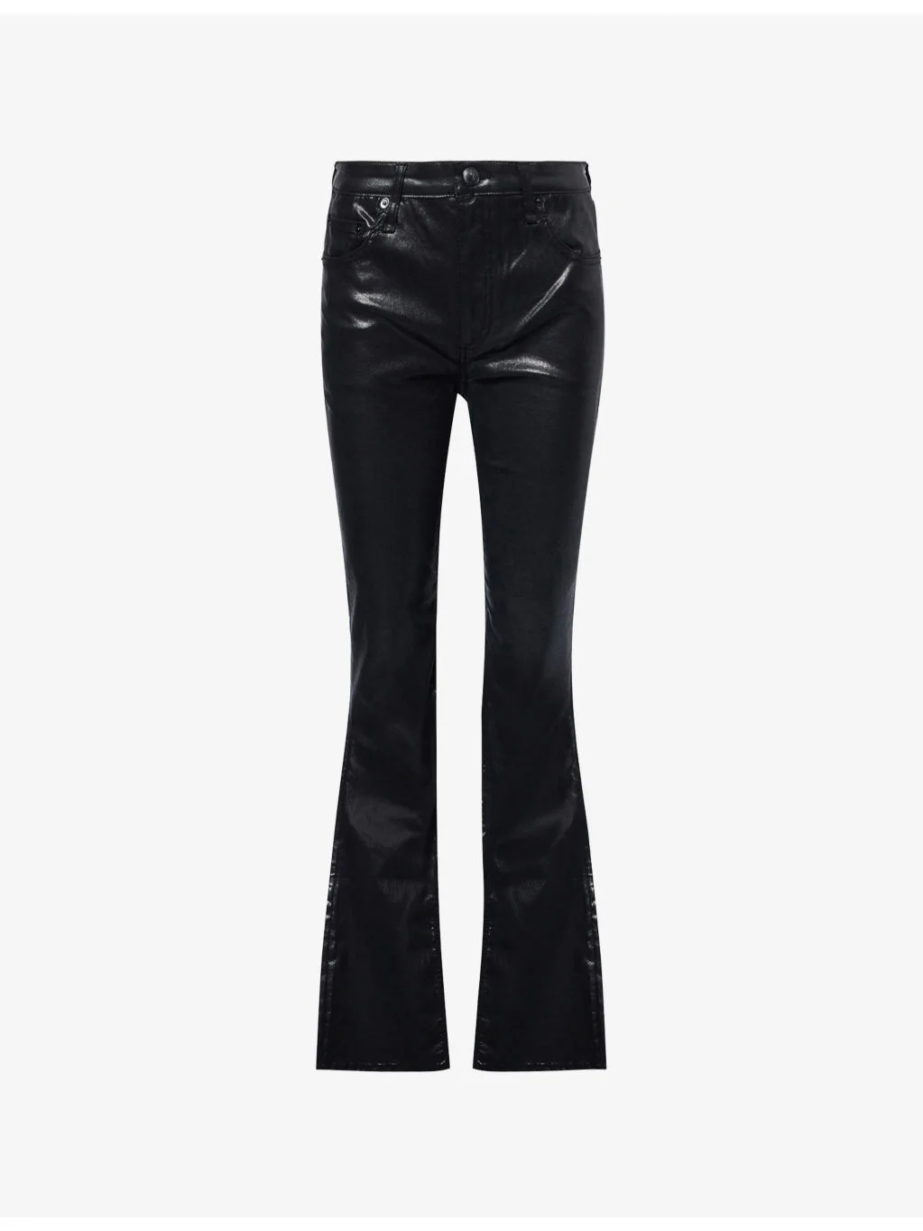 PRODUCT DETAILS - rag & bone coated-denim trousers - 68% cotton, 29% polyester, 3% other fibres - Button and zip-fly fastening - Regular fit, mid-rise, flared leg, belt loops, classic five pockets, brand patch at back, coated finish - Machine wash at 30°C - Made in Turkey - True to size - Size : rise 10.6in / 27cm, inside leg 33in / 84cm, leg opening 21.6in / 55cm - Model is 5ft 10in/1.78m and wears a size 26 - Midweight, non-stretch Ref: R04555583