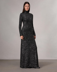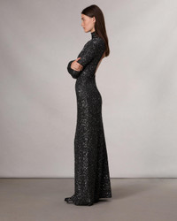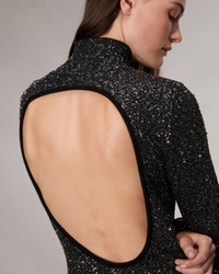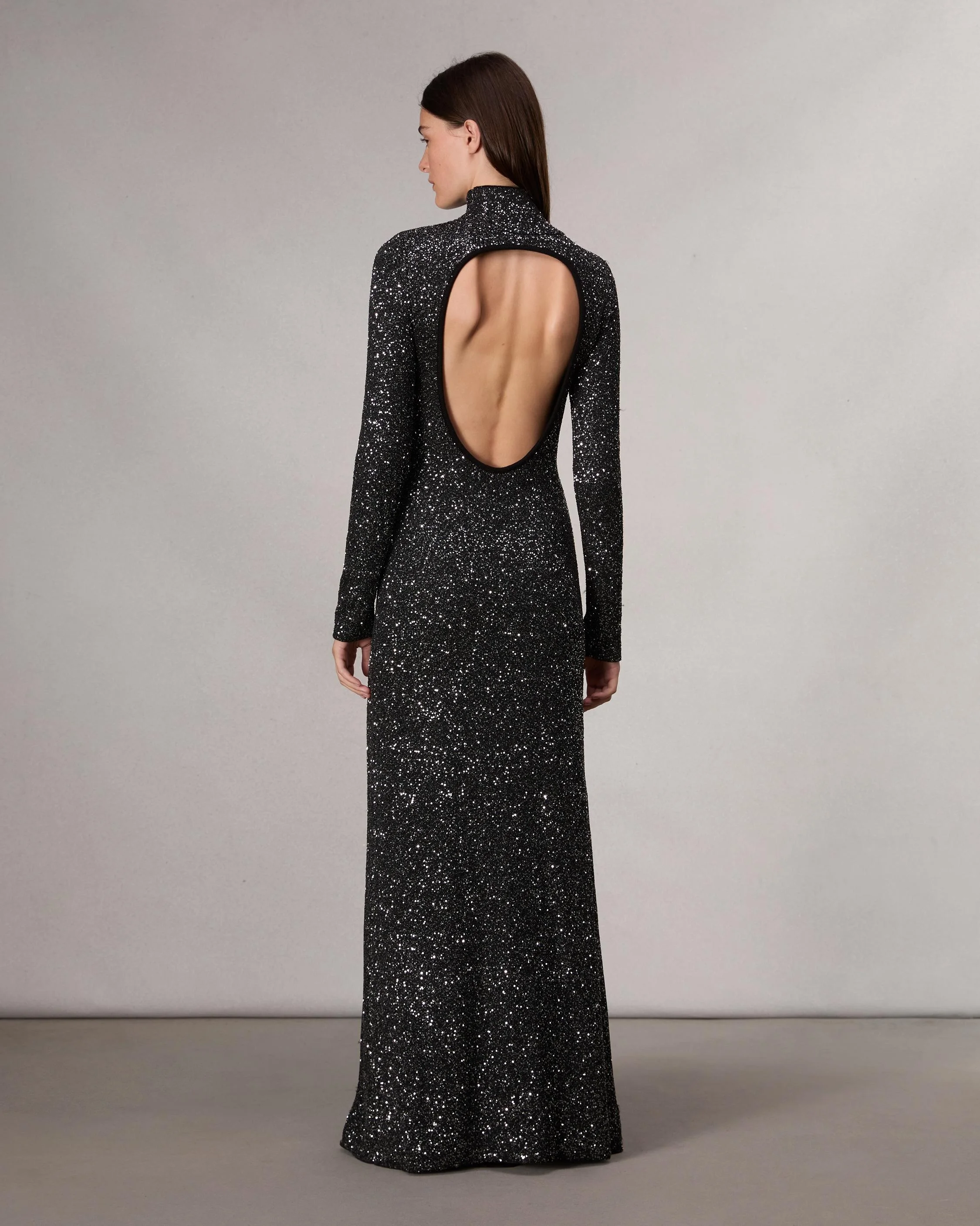 High-octane shine for the holiday season arrives in this sculptural maxi dress. It's specially knit from sequin yarn with a double-layer construction that ensures softness and comfort on the inside. An open back and elegant turtleneck further elevate the drama. Size & Fit Slim fit Size Small: Front length 57 1/2", chest 30 1/2", sweep 53" sleeve length 25" Model is 5'10.5" wearing a size small Features & Details 100% Polyester Dry clean Open back Imported Product ID: WAS24H015YA15