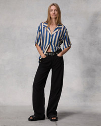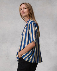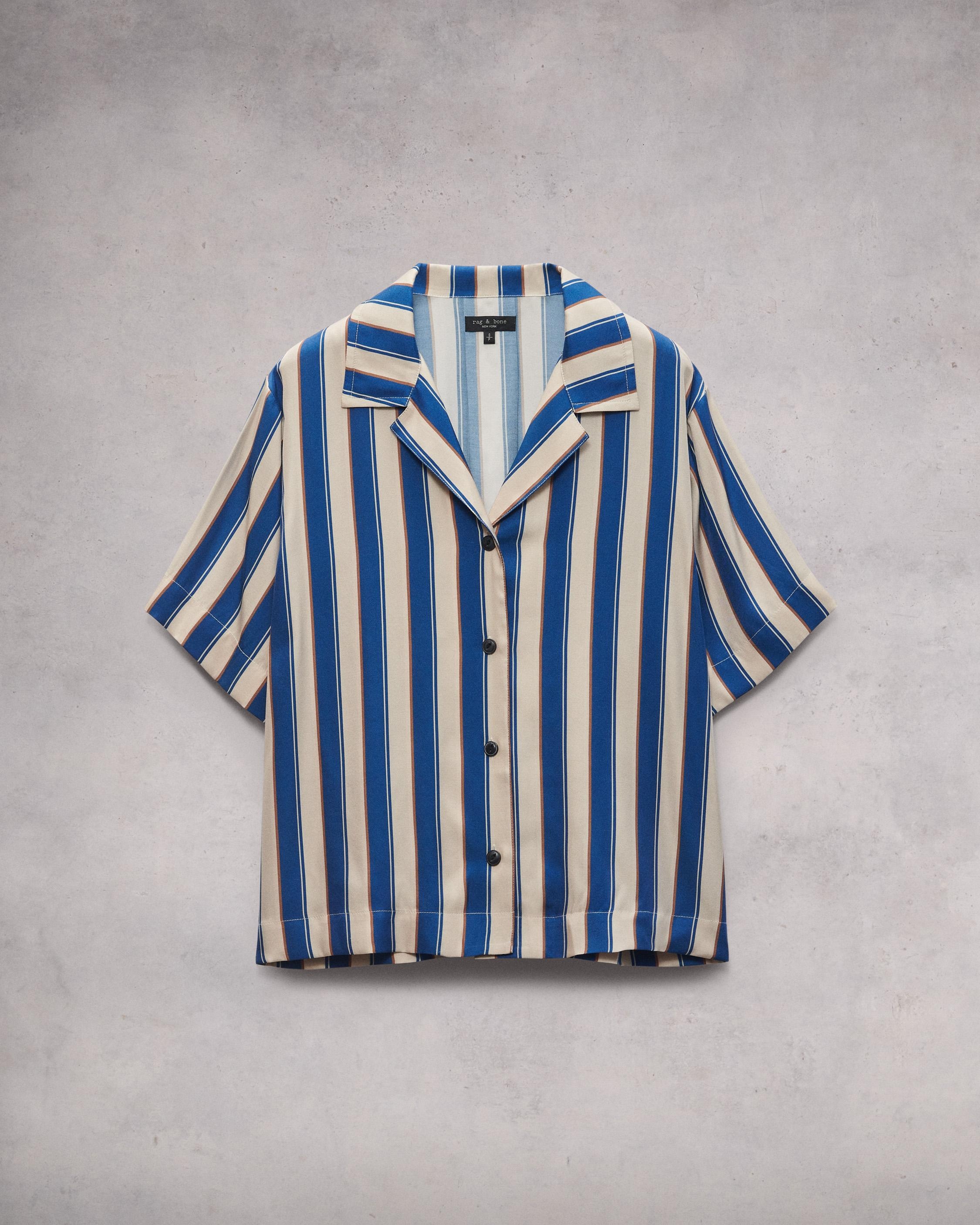 The Declan. Decidedly relaxed and effortlessly cool, our short sleeve shirt is tailored with a camp collar in our striped silk-rayon blend for a fluid feel. Pair it back to the Bailey pant. Size & Fit Relaxed fit, hits at the hip Size Small: 47" chest, 24 1/4" back length, 47" sweep, 18 1/2" sleeve length Model is 5'7.5" wearing a size small Features & Details 55% Silk 45% Rayon Dry clean only Buttons at center front Unlined Imported Product ID: WAW24PA0220422