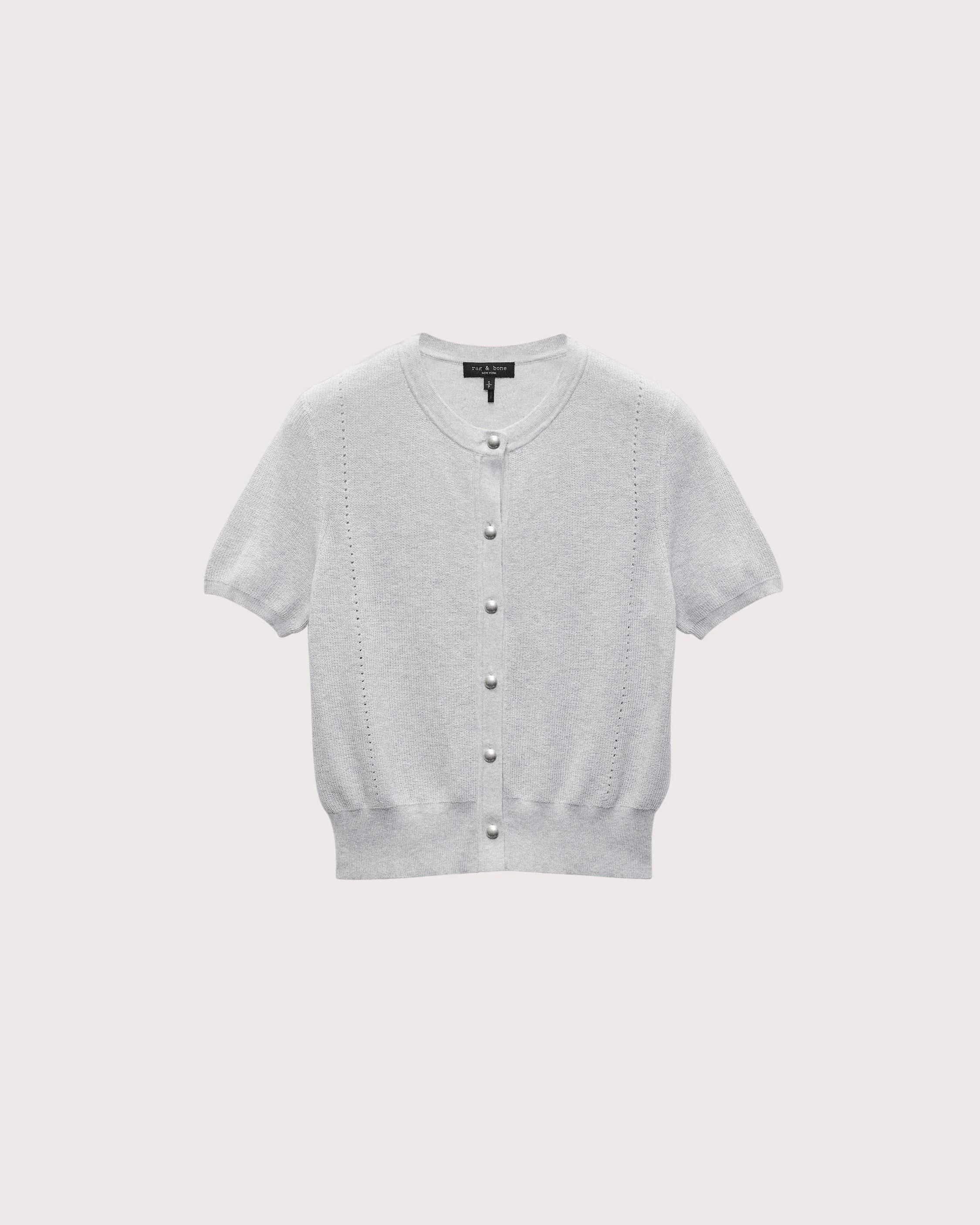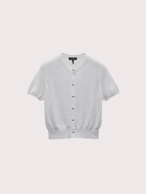 Our fitted, short-sleeve cardigan sweater, updated for the season in luxuriously soft yarn spun with cotton and cashmere. Metal buttons and our signature V-stitch seam detailing at the back complete its look. Size & Fit Classic fit Size Small: Body length 19 1/2", chest 33 1/2", sweep 25", sleeve length 8" Features & Details 65% Cotton 30% Cashmere 4% Nylon 1% Spandex Dry clean Metal buttons at center front placket Front button closure Imported Product ID: WAS24H057SA57