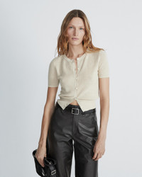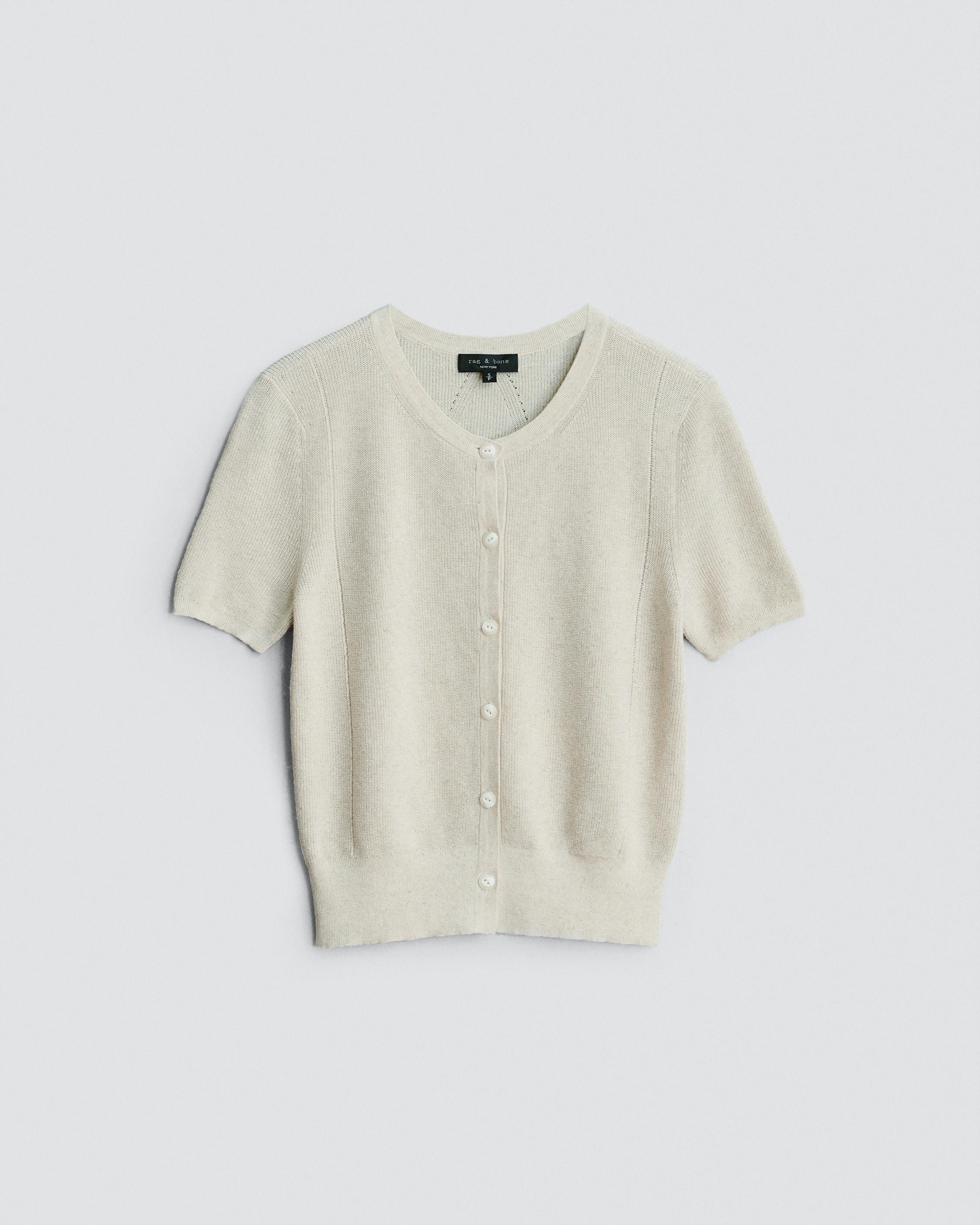 This fitted short sleeve cardigan is crafted from a stretch cotton linen blend for the perfect fit. Complete with recycled buttons down the center front. Size & Fit Slim fit Size Small: body length 19 1/4", chest 32 1/2", sweep 25", sleeve length from shoulder seam 8 " Model is 5'10" wearing a size small Features & Details Self: 63% Cotton 26% Linen 11% Nylon Trim: 51% Cotton 25% Nylon 22% Linen 2% Spandex Dry clean Recycled polyester buttons Imported Product ID: WAS23P005US05