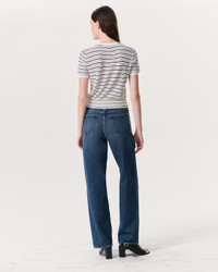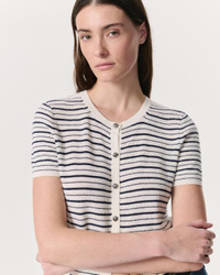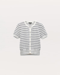 Our fitted, short-sleeve cardigan sweater, updated for the season with soft, lightweight yarn and nautical-inspired variegated stripes. Domed metal buttons and our signature V-stitch seam detailing at the back complete its look. Size & Fit Fitted cropped cardigan Size Small: Body length 19 1/2", chest 34", sweep 26", sleeve length 9" Model is 5'10.5 wearing size small Features & Details Main: 89% Cotton, 11% Nylon Trim: 73% Cotton, 25% Nylon, 2% Spandex Dry clean only Metal buttons at front placket Imported Product ID: WAS25S055US55