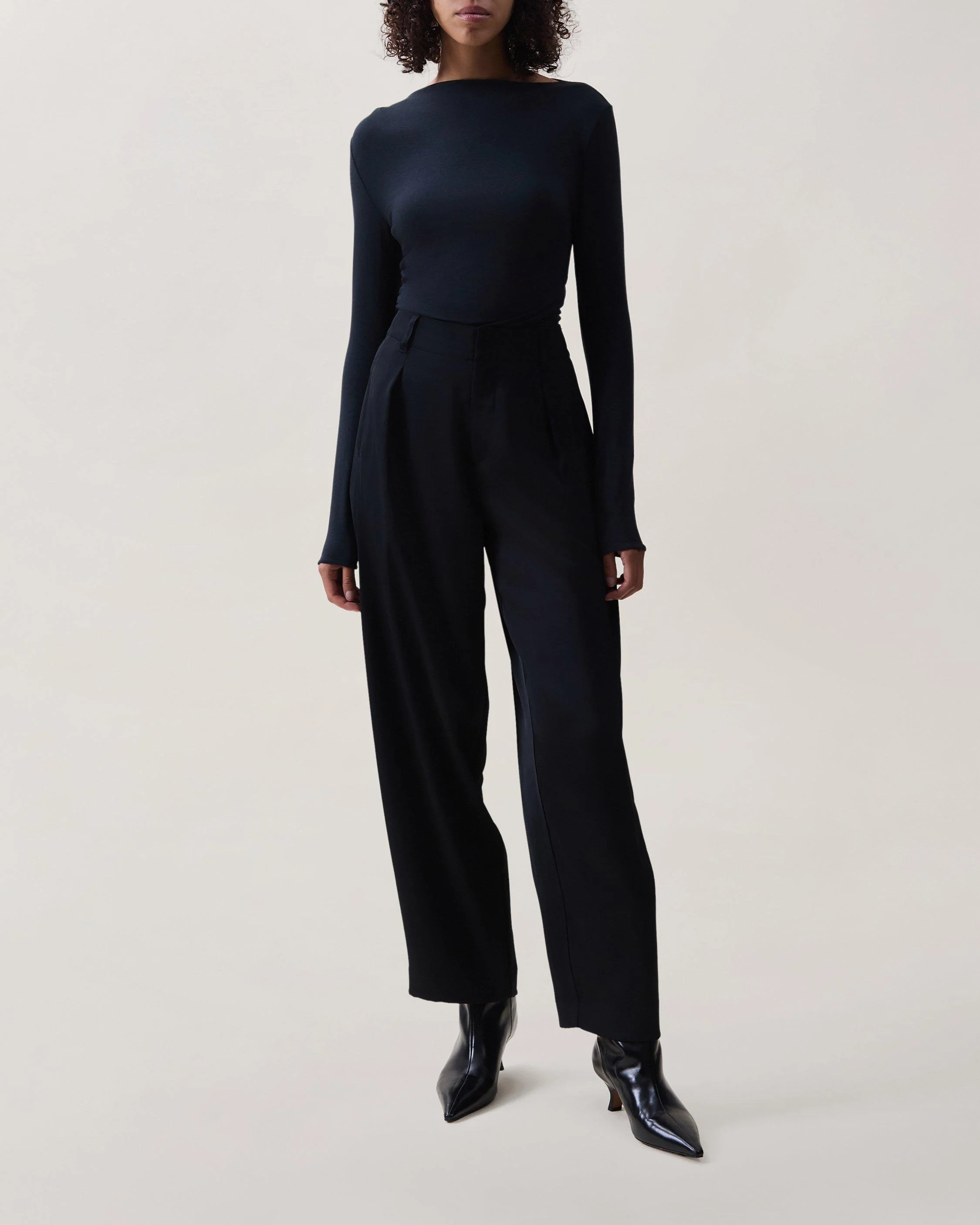 Effortless polish. Cut from muted satin, this pant brings a refined edge to everyday dressing. Designed with a mid-rise waist and front pleats for a relaxed yet tailored silhouette. The wide leg drapes clean and easy, creating movement with every step. Pair it with a crisp shirt or a slouchy knit. Either way, it�s understated luxury at its best. Size & Fit • Fits true to size • Size 4: Rise 12", inseam 30", leg opening 18" Features & Details • 100% polyester • Zip fly with hook-and-bar closure • Unlined • Welt side seam pockets and one back welt pocket • Machine wash cold inside out on delicate & tumble dry low • Do not dry clean • Imported Product ID: RA0825F7OSW
