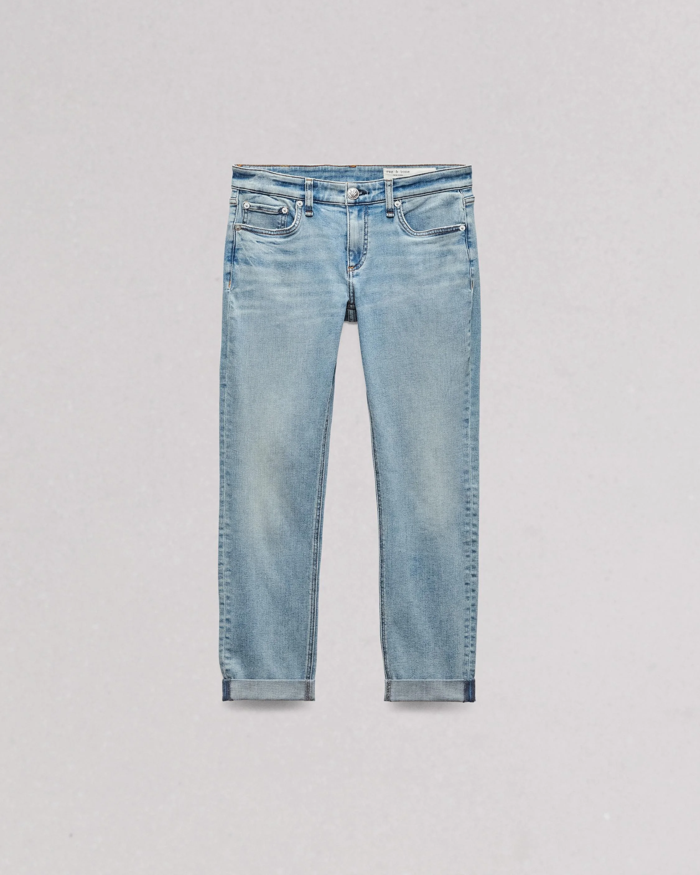 Meet Dre: our slim boyfriend jean. This low-rise, slim, zip fly jean is effortlessly relaxed through the hip and thigh. Size & Fit Low-rise slim boyfriend, ankle length when cuffed 8 3/4" rise, 30" inseam, 12 3/4" leg opening Model is 5'9.5" wearing a size 25 Features & Details 99% Cotton 1% Lycra Vintage stretch, light indigo wash Machine wash cold inside out with like colors; do not use bleach; hang to dry; do not iron; indigo may bleed Hidden center front zipper, dagger tack button, washer rivet Eggshell rag & bone embroidery with a cut hem and a double roll Zip button closure Five- pocket silhoutte Imported Product ID: WDD23H2678FUDA