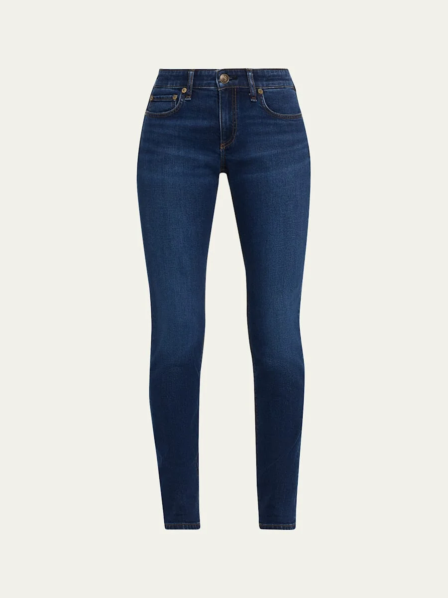 Cut from darkwash denim with a hint of stretch for allday comfort, the "Dre" jeans by Rag amp; Bone feature light fading through the knees and cuffed hems Approx. 8.8" rise; 30" inseam Lowrise sits at hip Fivepocket style Full length Slim fit through skinny legs Button/zip fly; belt loops Cotton/spandex Imported