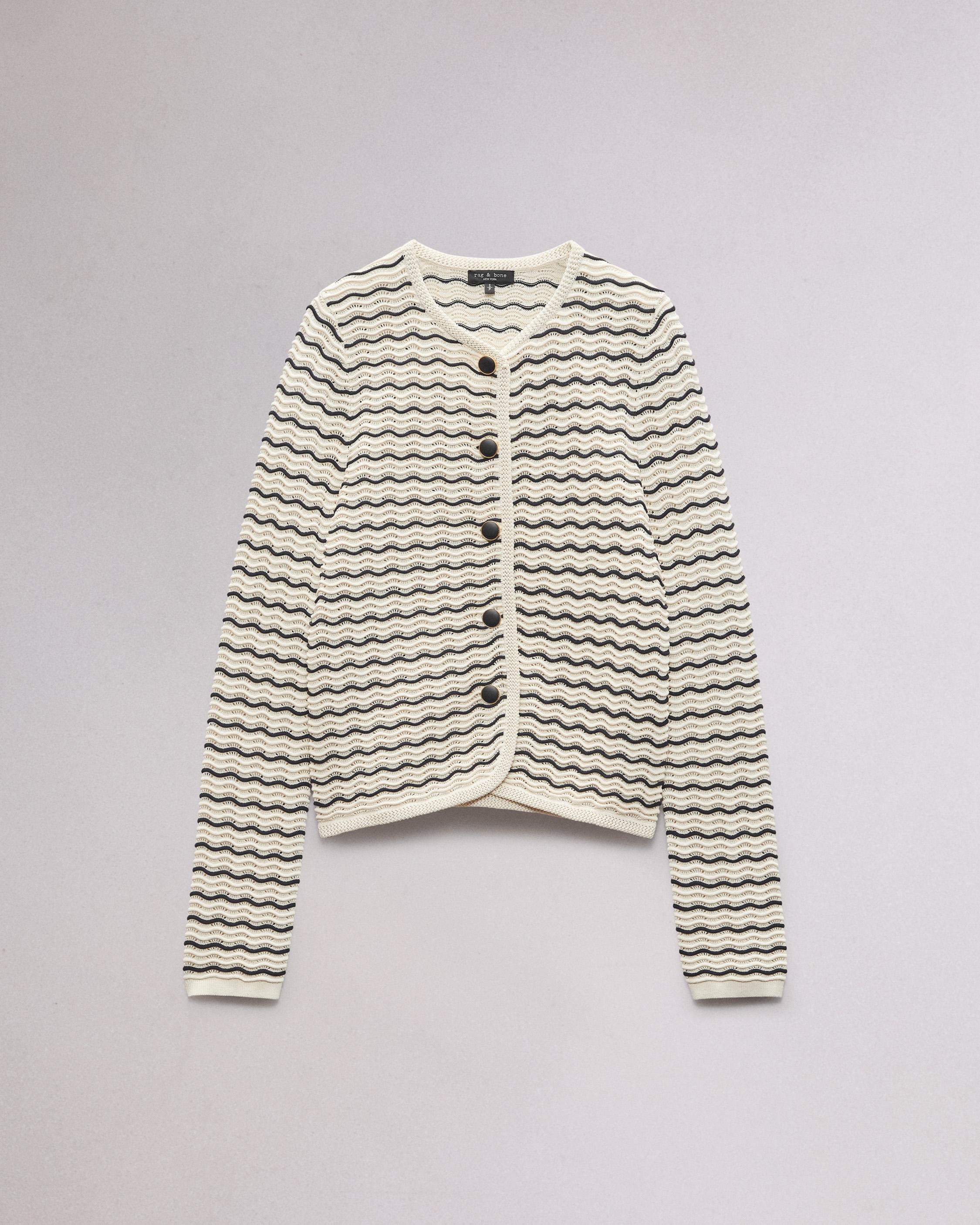The Elisa. Instantly polishes any look. Our favorite new layer is knit in stripes of cotton-blend with a subtle wavy texture with metal buttons down the front. Size & Fit Relaxed fit Size Small: Body length 20 1/2", chest 35", sweep 34 1/2", sleeve length 24" Model is 5'7.5" wearing a size small Features & Details 60% Cotton 40% Nylon Dry clean only. Metal buttons Imported Product ID: WAS24F068UG68