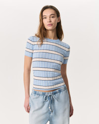 Bright texture for the season ahead. Crafted from lightweight rib-knit yarn with a touch of stretch, this fitted striped sweater will colorfully carry you through spring and summer. Size & Fit Relaxed fit ribbed short-sleeve sweater Size Small: Body length 22 1/2", chest 27", sweep 28", sleeve length 8" Model is 5'10" wearing size small Features & Details 48% Viscose, 21% Nylon, 19% Cotton, 9% Polyester, 3% Spandex Hand wash cold, do not bleach, lay flat to dry, cool iron on the reverse side if needed or dry clean Imported Product ID: WAS25S030YF30