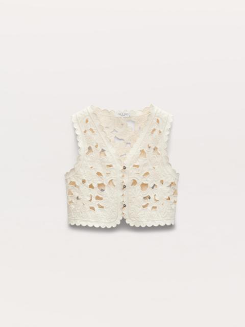 Summer stripes. This fitted jean vest updates a classic tailored silhouette for the season in striped cotton-linen denim with a broken-in look and feel (plus a comfortable touch of stretch). The halter neckline, open back, and signature metal buttons complete its distinctive look. Size & Fit • Fitted • Fits true to size • Size 4 : Front length 22.5" | center back length 6.5" | chest 30.5" • Model is 5'11" wearing size 2 Features & Details • 85% cotton, 13% linen, 2% elastane • Signature dagger tack buttons • Button closure • Halter neckline with an open back • Machine wash • Imported Product ID: WDD25PA003VSTS