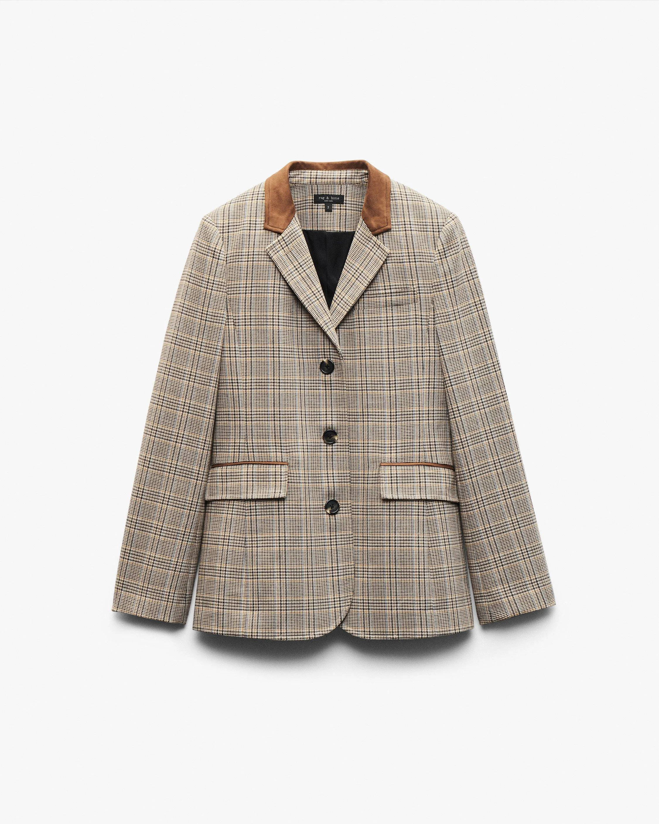 Heritage roots. Modern attitude. Tailored from a soft wool blend in a custom plaid, this three-button blazer features faux suede trims and a relaxed, slightly longer silhouette. Make it a full suit with the matching Shea Plaid Pants, or keep it casual with jeans. This style runs large, so for the closest fit, consider sizing down. Size & Fit • Relaxed fit • Fits large to size. Consider sizing down for a closer fit. • Size 4: Body length 28.75", back length 27", chest 36", 32.5" sleeve length • Model is 5'10" wearing size 2 Features & Details • Body: 58% wool, 42% polyester • Lining: 51% viscose, 49% polyester • Suede: 92% polyester, 8% spandex • Dry clean only, delicate process • Remove detachable accessories • Buttons at center front and cuffs • Suede collar & pockets • Pockets at hip & welt pockets at chest • Button closure • Imported Product ID: RA1A25F4MHT