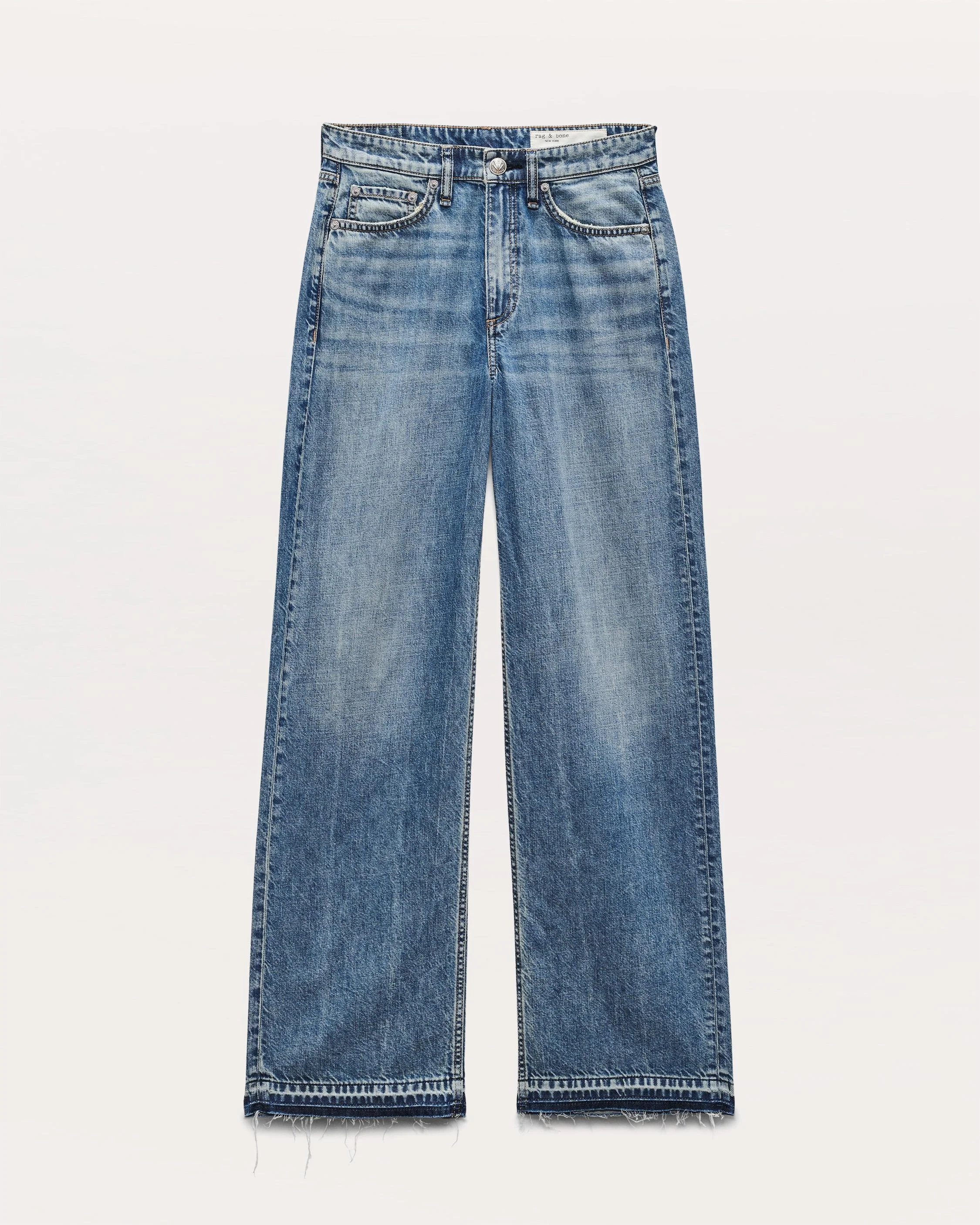The Logan. Our laid-back, mid-rise jeans with a roomy fit through the hip and thigh down to a released hem. (Pro tip: Take your natural size and wear low on your waist for a relaxed look, or size down for a higher rise.) Crafted from our Featherweight denim that's supremely soft and super light, with an easy drape. In Orian, a light indigo wash. Size & Fit Mid-rise, wide leg, full length Size 26: 11 5/8" front rise, 31 1/2" inseam, 20" leg opening Model is 5'10.5 wearing size 25 Features & Details 64% Cotton, 36% Lyocell Featherweight Denim in Orian, a light indigo wash. Machine wash cold inside out with like colors, gentle cycle, do not use bleach, hang to dry, low iron if need, color may transfer. Zip fly with signature dagger button closure and metal rivets Five-pocket silhouette Imported Product ID: RJ2525F1FOR