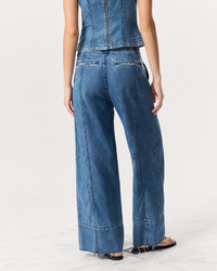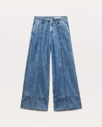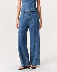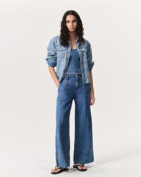 The Arianna. Our take on palazzo pants. Defined by a loosely fitted waist and wide, flowing legs with raw hems that hit at the ankle. Crafted from our Featherweight denim that's supremely soft and super light, with an easy drape. In Beekman, a medium indigo wash with seam details. Size & Fit Mid-rise, cropped wide leg Size 26: 12" front rise, 30" inseam, 25 3/4 " leg opening Model is 5'10" wearing size 25 Features & Details 64% Cotton, 36% Lyocell Featherweight Denim in Beekman, a medium indigo wash Machine wash cold inside out with like colors, gentle cycle, do not use bleach, hang to dry, low iron if needed, color may transfer Signature dagger shank button at center front with a zipper fly, metal rivets Five-pocket silhouette Imported Product ID: WDD25S2991FWBE