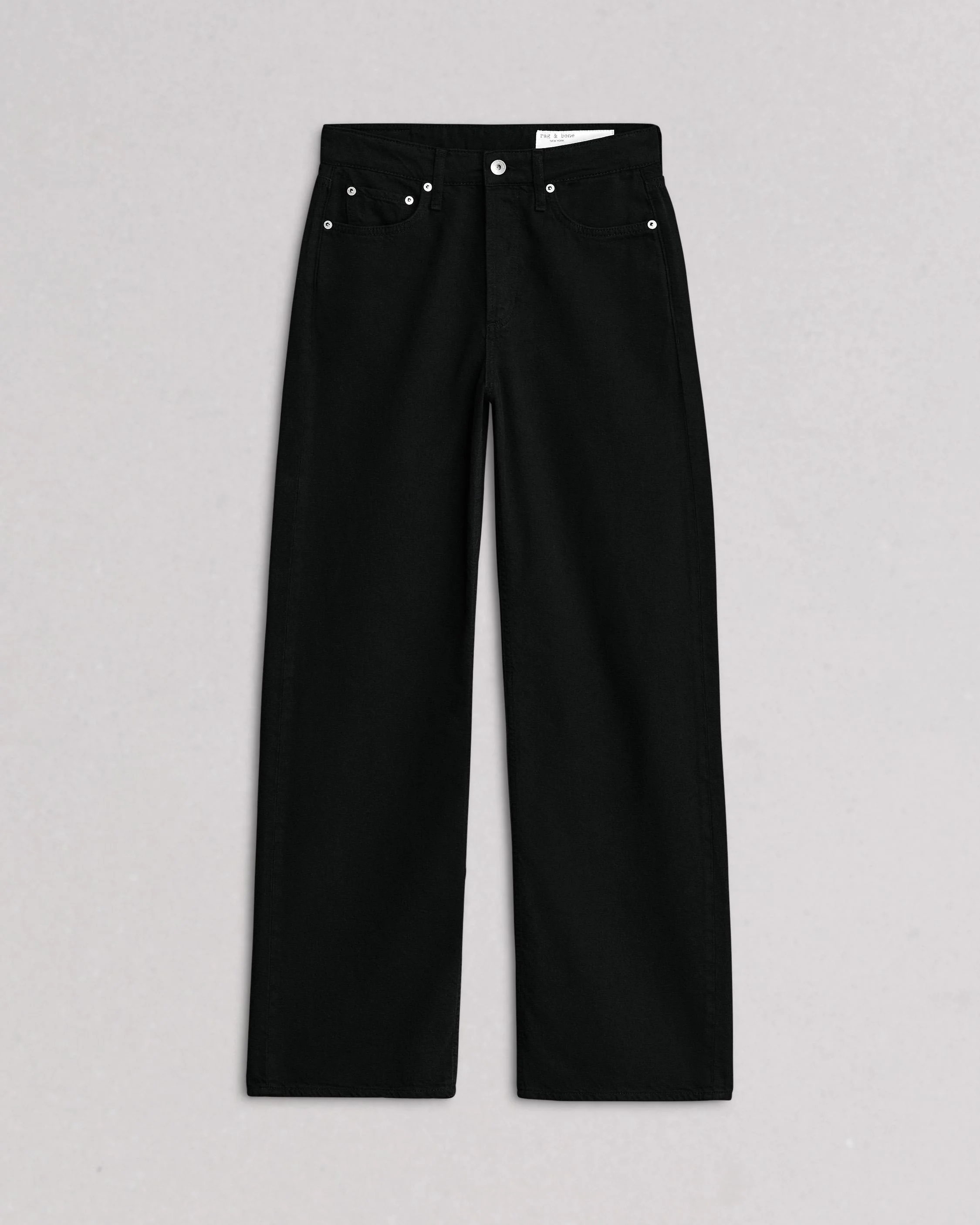 The Logan is a laid-back, wide-leg, mid-rise jean made from our ultra-light Featherweight denim. With a roomy cut through the hip and thigh, it doesn't get more comfortable than this. Available in Black. Pro tip: take your natural size and wear low on your waist for a relaxed look or size down for a higher rise. Size & Fit Relaxed fit, mid-rise, wide leg jean, true to size Size 26: 11 5/8" rise, 31 1/2" inseam, 20" leg opening Model is 5'11 wearing a size 25 Features & Details 61%Organic Cotton 39%Recycled Lyocell Machine wash cold inside out with like colors. Do not use bleach. Hang to dry. Do not iron. Indigo may bleed. Silver dagger shank, silver button fly, silver rivets, black glossy paper patch Imported Product ID: WDD22H2935STBL