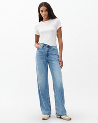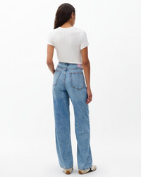 The Logan is a laid-back, wide-leg, mid-rise jean made from our ultra-light Featherweight denim. With a roomy cut through the hip and thigh, it doesn't get more comfortable than this. Pro tip: take your natural size and wear low on your waist for a relaxed look or size down for a higher rise. Available in Audrey, a light indigo wash. Size & Fit • Mid rise, relaxed fit • Wide leg jean • Size 26: 11.5" rise, 31.5" inseam, 20" leg opening • Model is 5'10" wearing a size 25 Features & Details • 64% cotton, 36% lyocell • Machine wash cold, do not use bleach • Hang to dry, do not iron • Indigo may bleed • Zip fly with a button closure & clean hem • Light weight rigid fabric, light indigo wash • Imported Product ID: RJ2525F1FAU