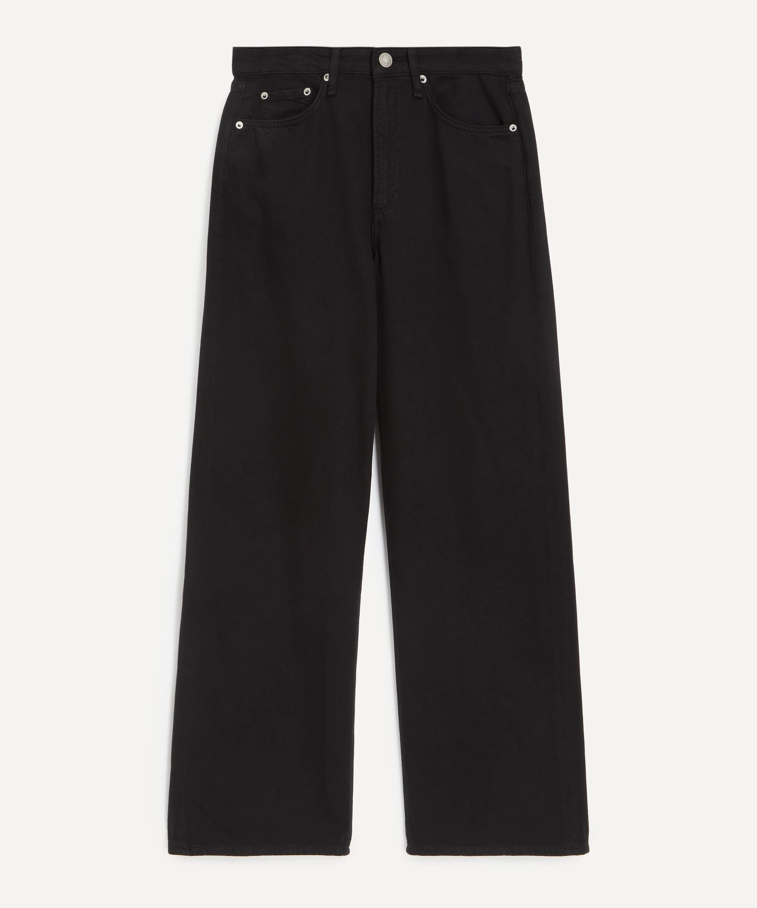 DETAILS Logan jeans Lightweight Featherweight denim Mid-rise Relaxed fit Wide leg Full length Front rise: 11 5/8” Inseam: 31 1/2” Leg opening: 20” Designer wash: Black Silver dagger shank Silver button fly Silver rivets 5-pocket construction Black glossy jacron patch Light fading and whiskering throughout SIZE & FIT Model is 175cm/5'9"; Chest: 76cm; Waist: 58cm; Hip: 90cm and wears a size 27 COMPOSITION & CARE 61% Cotton; 39% Lyocell Machine wash cold inside out with similar colours. Gentle cycle, do not use bleach. Hang to dry, low iron if need