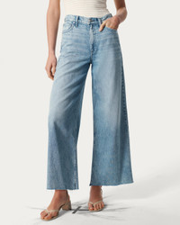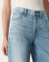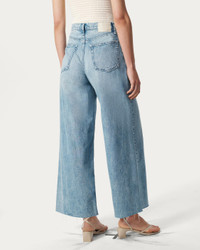The Sofie. High-rise jeans with super-wide cropped legs that are rag & bone office favorites. Crafted from our Featherweight denim that's supremely soft and super light, with an easy drape. Feels airy & effortless. In Mira, a light indigo wash with a cut hem. Size & Fit • High-rise • Relaxed wide, ankle-length leg • Size 26: 12" front rise | 30" inseam | 25.25" leg opening • Model is 5'11" wearing size 25 Features & Details • 64% cotton, 36% lyocell • Featherweight Denim • In Mira, a light indigo wash with a cut hem • Zip fly with a button closure • Signature dagger shank button, metal rivets • Signature dagger shank button, metal rivets • Machine wash cold inside out on delicate & lay flat to dry • Color may bleed • Imported Product ID: RJ1425F1FMI