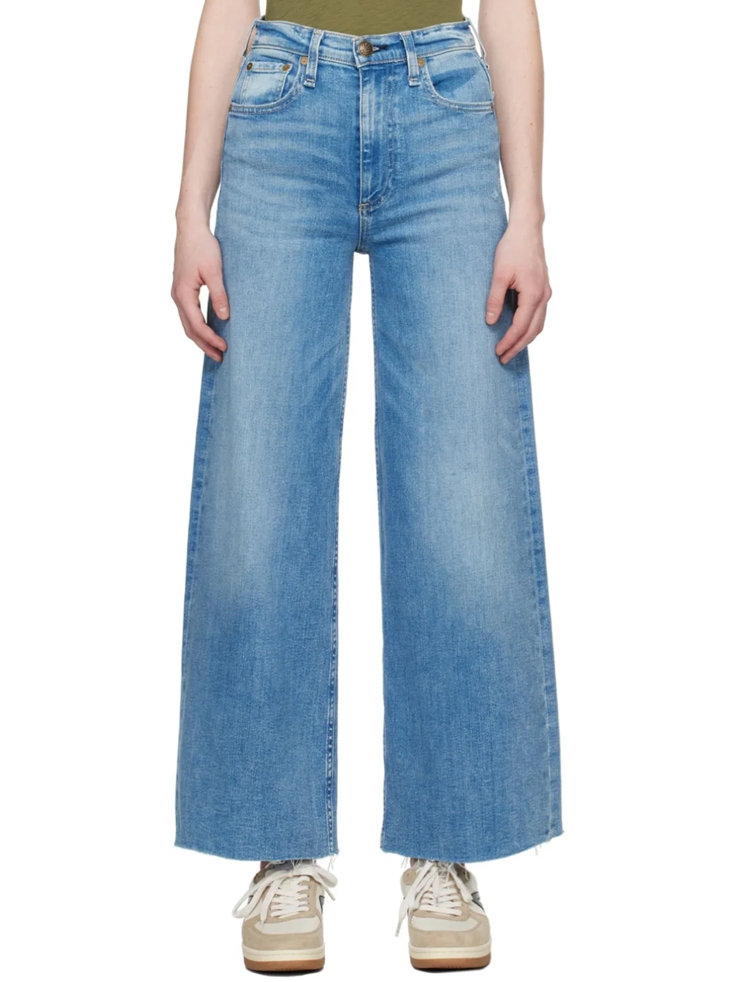 Wide-leg stretch cotton- and lyocell-blend denim jeans. Moisture-wicking and breathable. · Fading, whiskering, and subtle distressing throughout · High-rise · Belt loops · Five-pocket styling · Zip-fly · Raw edge at cuffs · Leather logo patch at back waistband · Logo embroidered at back pocket · Contrast stitching in beige Supplier color: Monterosso