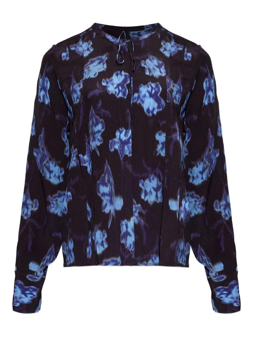 floral-print blouse Highlights - Dark blue - Tie fastening - Long sleeves - Pleated details Imported Composition Viscose 100% Washing instructions Read Manufacturer Guidelines