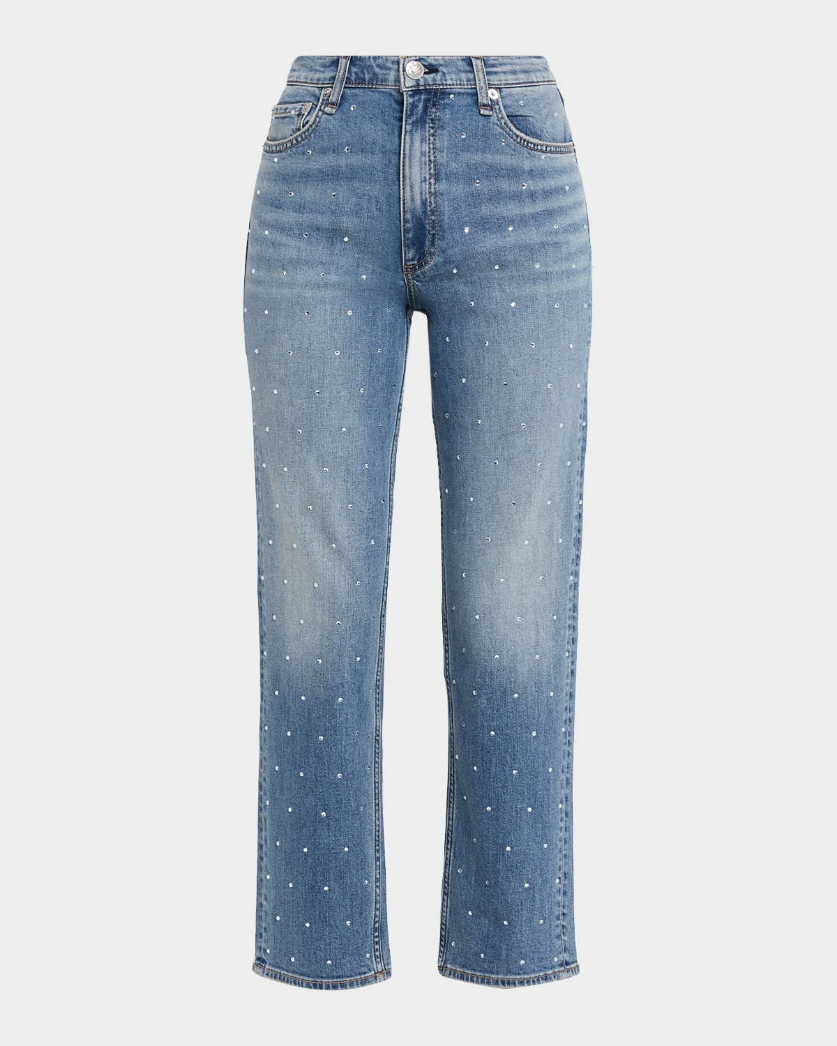 Rag amp; Bone "Harlow" straightleg jeans with crystal embellishment in stretch denim Approx. 11" rise; 28.5" inseam High rise Fivepocket style Easy fit Ankle length Button/zip fly; belt loops Cotton/spandex Dry clean Imported