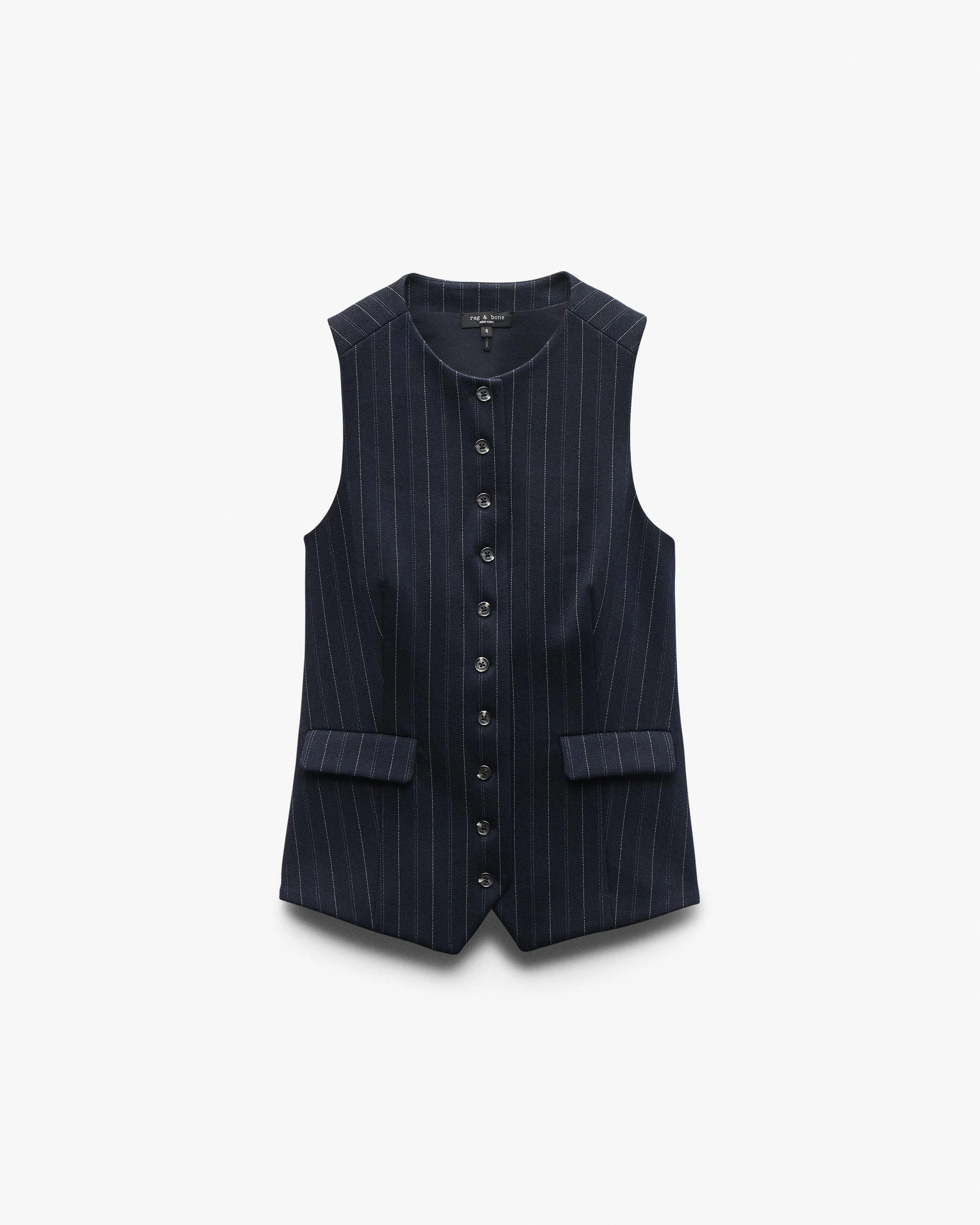For a new take on classic tailoring, we cut this streamlined button-up vest from our bestselling ponte fabric, a stretch knit which balances structure and ease for around-the-clock polish at work and beyond. The lined style's slim, hip-length silhouette works just as well with jeans as it does with leather pants and suiting trousers. An added bonus? It's machine washable, making it an easy choice for any occasion. Size & Fit • Slim fit • Fits true to size • Size 4: Body length 25.25", chest 34.5", sweep 38.5" • Model is 5'9" wearing size 2 Features & Details • 66% viscose, 30% nylon, 4% elastane • Machine wash cold on delicate & tumble dry low or dry clean • Faux horn buttons • Flat front pockets • Front button closure • Imported Product ID: RE8925FV1PW