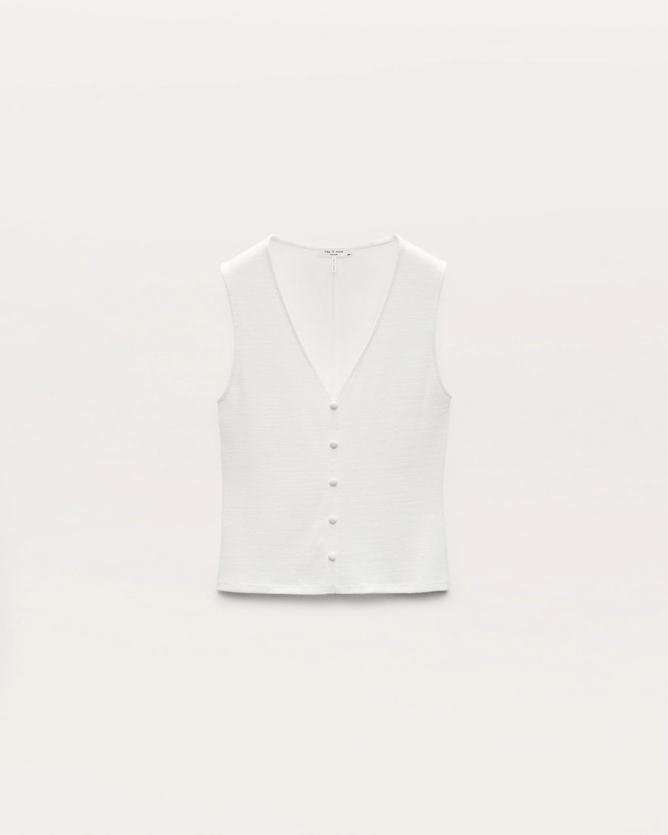 The polish of a vest meets the ease of a tank. This slim-fit top is knit from two different types of lightweight, super-soft stretch yarn for a sleek yet comfortable look wherever you wear it. It fastens up the front with tonal covered buttons. Size & Fit • Slim fit • Fits true to size • Size Small: Body length 20", chest 29", sweep 30" • Model is 5'11" wearing size small Features & Details • 48% rayon, 48% polyester, 4% spandex • Machine wash cold on delicate & tumble dry low or dry clean • Self-covered buttons • Button closure • Imported Product ID: WCC24PT002C702