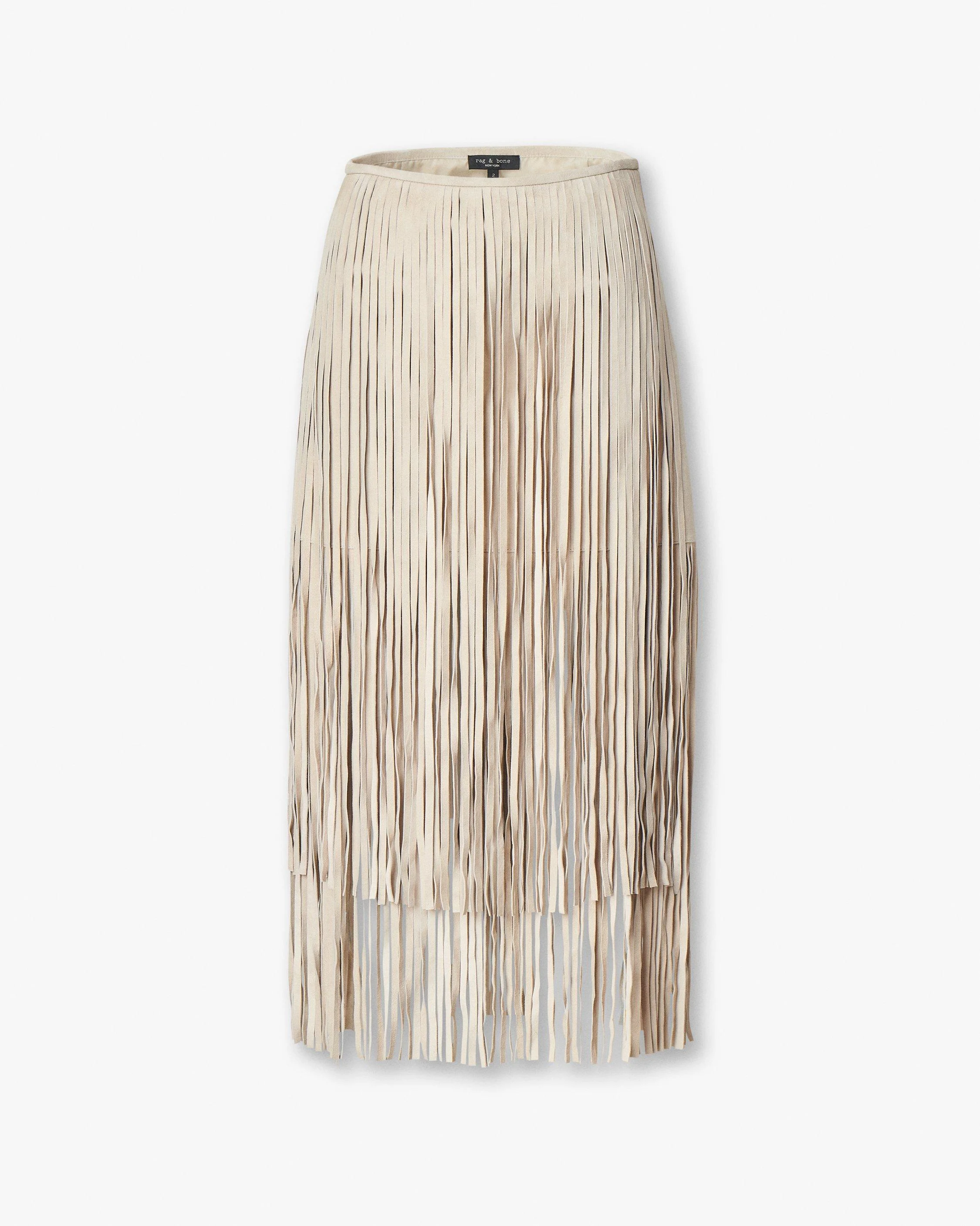 Fringe benefit. Crafted entirely from soft suede, this skirt combines midi-length fringe layered over a fringed mini skirt. With an ultra-luxurious feel, it brings unique movement and a statement look to any dance floor or dinner plan this party season. Pair yours with metallic ballet flats to create contrast or match it to the Kara Suede Jacket for a monochromatic moment. Size & Fit • Low-rise • Column fit • Fits true to size • Size 4: Front length 35.25", sweep 40.5" • Model is 5'8" wearing size 2 Features & Details • Body: 100% suede • Lining: 100% polyester • Twill lining • Zip fly with a hook-and-eye closure • Professional leather clean only • Imported Product ID: RA7R25HBMEM