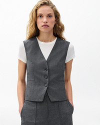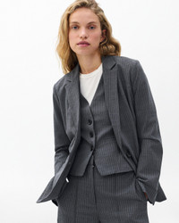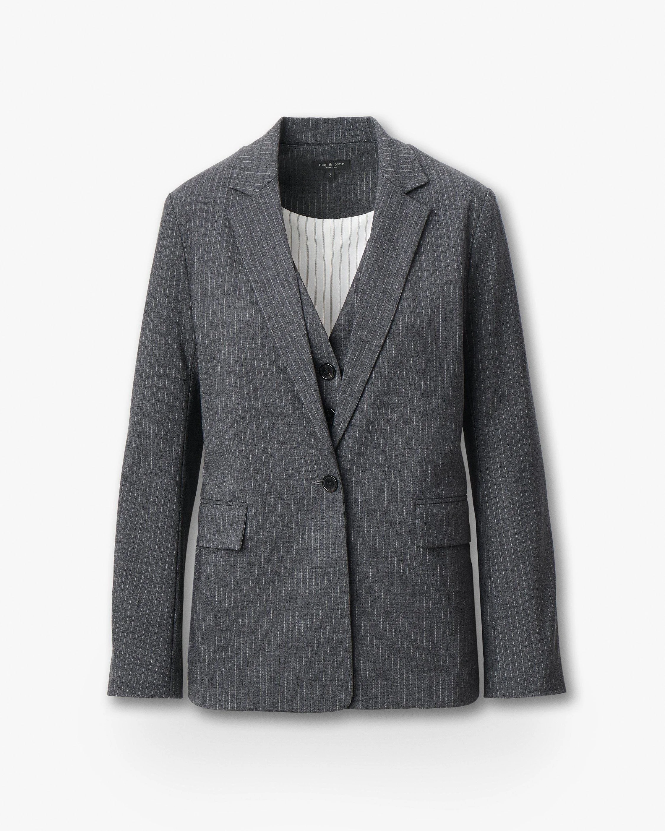 Double time. This striped single-button blazer is cut for a relaxed fit from a fine wool blend. It includes a matching, slim-fit vest that you can remove whenever you wish. Enjoy wearing either on their own, or together for a two-piece look. Pair with denim for a dressed-down feel, or with trousers to create a suit. Selected by Athena Calderone for The Gift of Style , the author and designer's edit of favorite pieces to give and receive. Size & Fit • Relaxed-fit blazer • Slim-fit vest • Fits true to size • Size 4 Blazer: Body length 29", back length 27.25", chest 40", sleeve length 32.5" • Size 4 Vest: Body length 21.5", back length 19.75", chest 34.5" • Model is 5'9" wearing size 2 Features & Details • Body: 85% wool, 10% polyester, 5% elastane • Lining: 100% polyester • Pocketing: 51% viscose, 49% polyester • Felt: 100% polyester • Striped lining • Button front closure • Blazer: Felt undercollar • Button at center front and at sleeve center back vents • Attachment button at center back neck • Buttons at center front, sleeves & center back vents • Inside vest: Buttons at center front • Blazer: Two front hip pockets • Vest: Two welt hip pockets • Dry clean only • Imported Product ID: RA9X25H4MTA