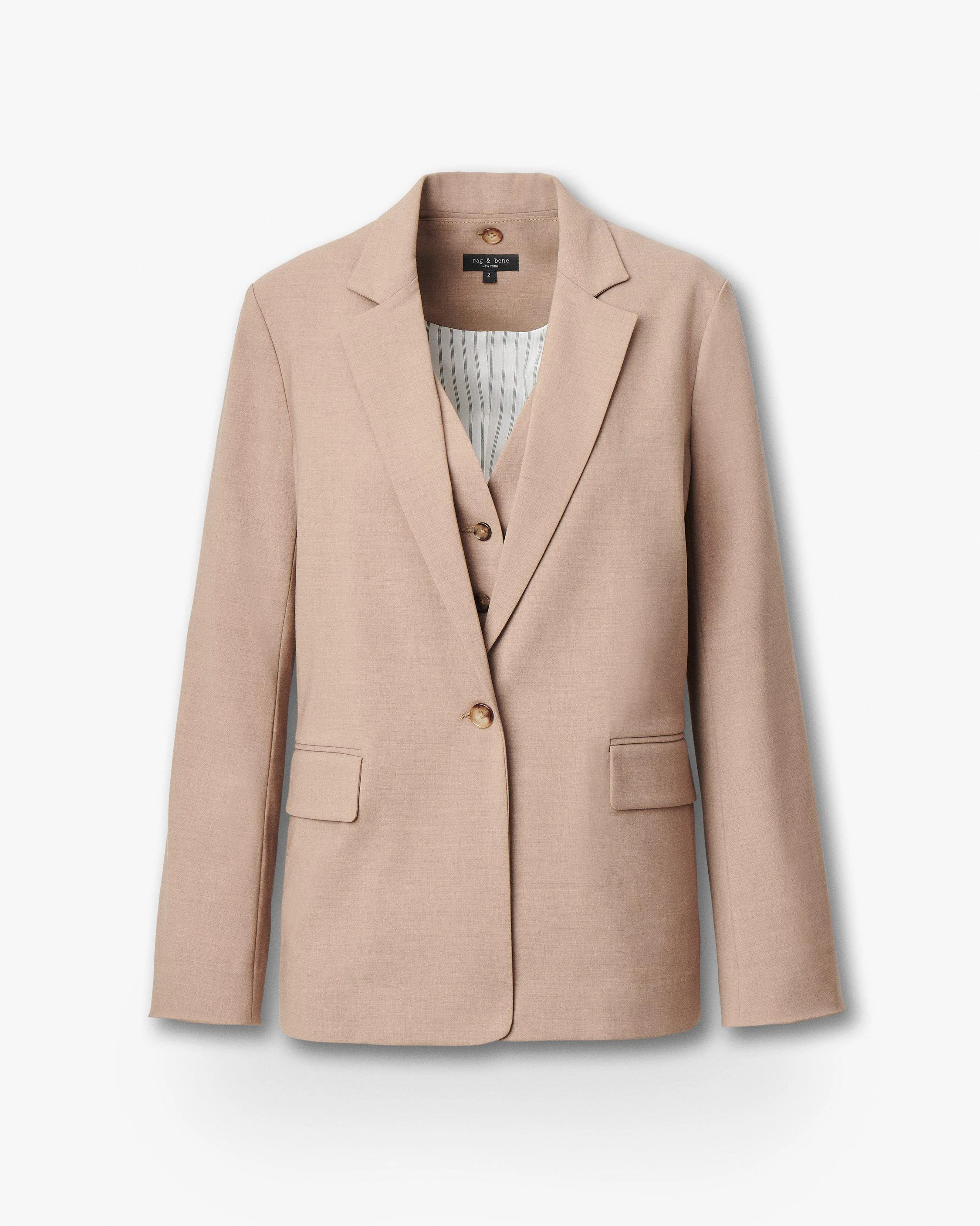 Double time. This single-button blazer is cut for a relaxed fit from a fine wool blend. It includes a matching, slim-fit vest that you can remove whenever you wish. Enjoy wearing either on their own, or both together for a two-piece look. Pair with denim for a dressed down feel, or with trousers to complete a suited look. Size & Fit • Relaxed-fit blazer • Slim-fit vest • Fits true to size • Size 4 Blazer: Body length 29", back length 27.25", chest 40", sleeve length 32.5" • Size 4 Vest: Body length 21.5", back length 19.75", chest 34.5" • Model is 5'8" wearing size 2 Features & Details • Body: 85% wool, 10% polyester, 5% elastane • Lining: 100% polyester • Pocketing: 51% viscose, 49% polyester • Felt: 100% polyester • Striped lining • Button front closure • Blazer: Felt undercollar • Button at center front and at sleeve center back vents • Attachment button at center back neck • Buttons at center front, sleeves & center back vents • Inside vest: Buttons at center front • Blazer: Two front hip pockets • Vest: Two welt hip pockets • Dry clean only • Imported Product ID: RA0Y25H4MTA