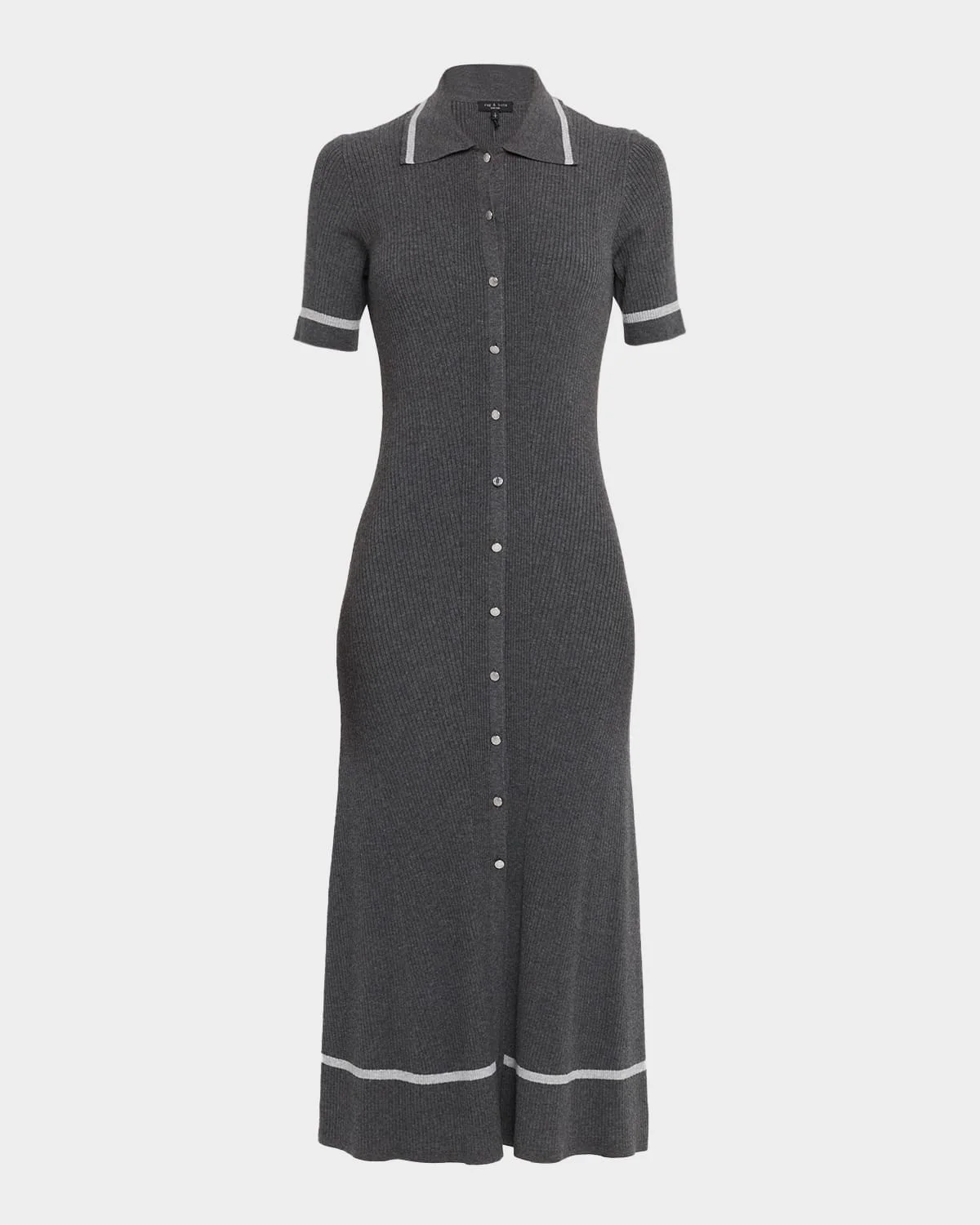 Crafted in a soft ribbed knit, the "Kassy" midi dress by Rag amp; Bone features stripe detailing for a refined silhouette. Point collar; buttonfront Short sleeves Shirtdress silhouette Hem falls below the knee Viscose/polyester Imported