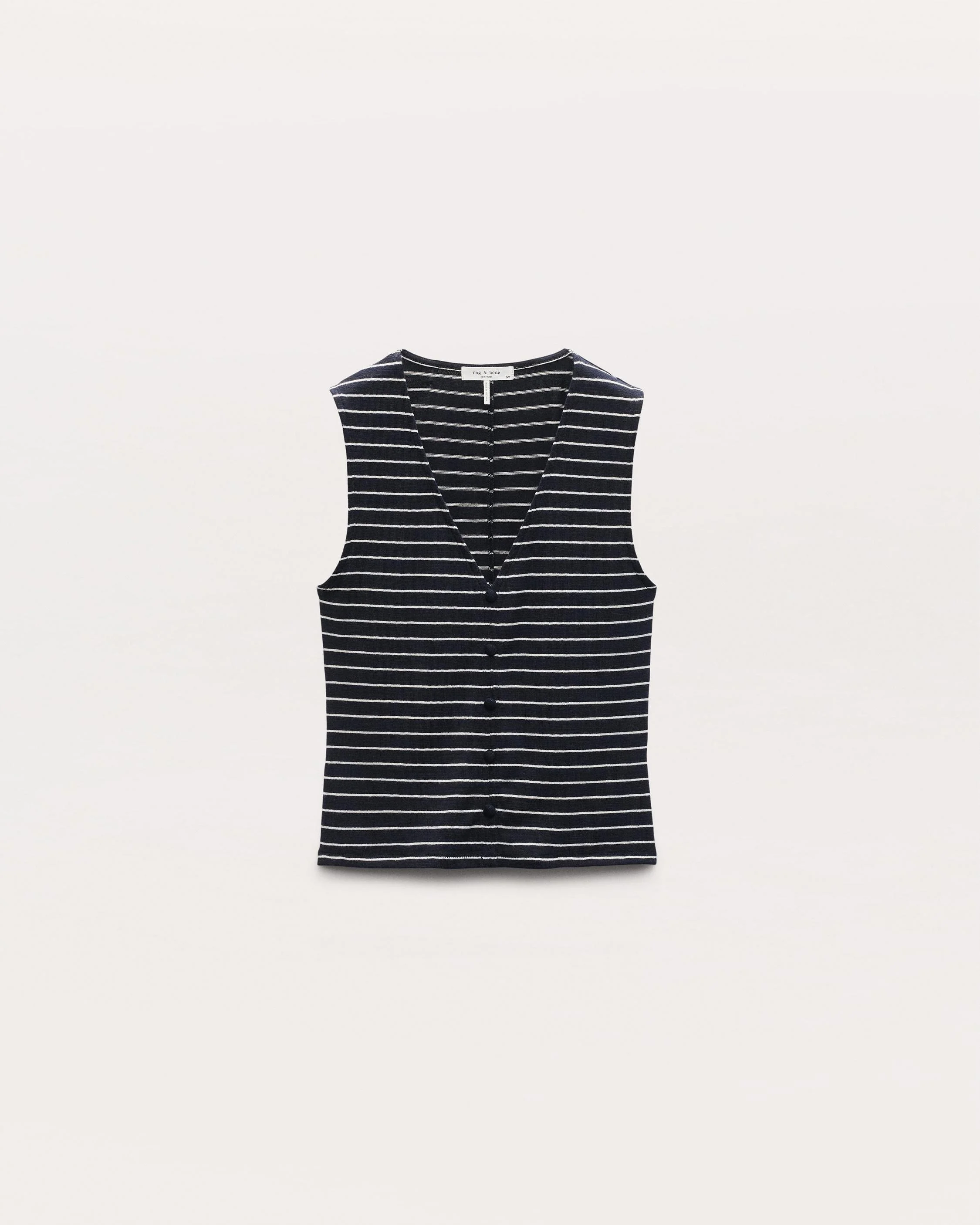 The polish of a vest meets the ease of a tank. This slim-fit striped top is knit from two different types of lightweight, super-soft stretch yarn for a sleek yet comfortable look wherever you wear it. It fastens up the front with tonal covered buttons. Size & Fit • Slim fit • Fits true to size • Size Small: Body length 20", chest 14.75", sweep 30" • Model is 5'11" wearing size small Features & Details • 48% rayon, 48% polyester, 4% spandex • Machine wash cold on delicate & tumble dry low or dry clean • Self-covered buttons • Button closure • Imported Product ID: WCC24P7021C721