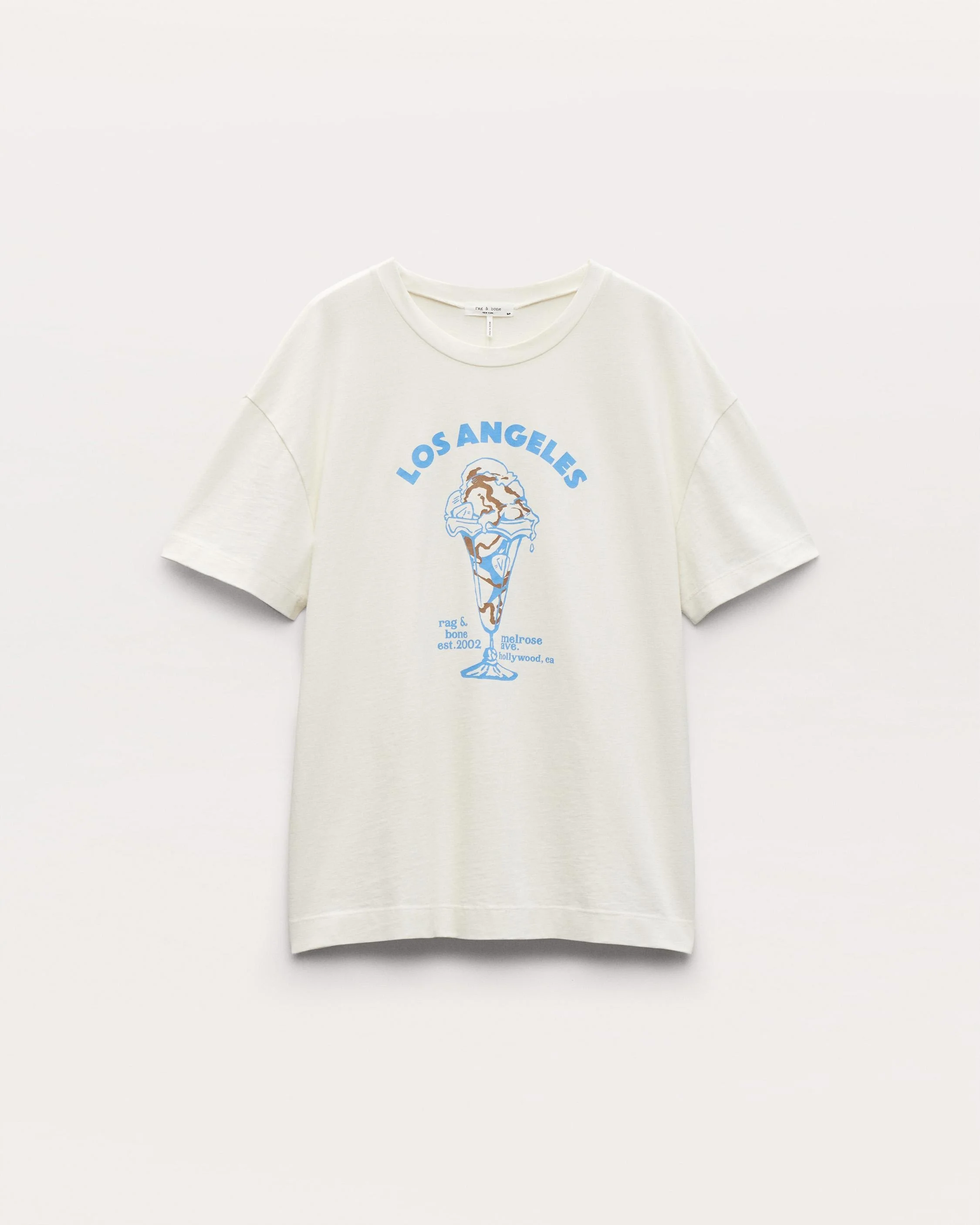 Sweet spot. Like a wearable postcard from Los Angeles, this laid-back, oversized tee features a vintage-y ice cream sundae print inspired by a summer day in L.A. It's cut from Peruvian cotton jersey that feels soft & smooth. Take your typical size for its intended looser look, or size down for a closer fit. Size & Fit • Oversized boyfriend tee • Fits large to size. Consider sizing down for a closer fit. • Size Small: body length 26.5" | chest 40.5" | sweep 41.5" | sleeve length 7" • Model is 5'11" wearing size small Features & Details • 100% cotton • LA Ice Cream graphic custom-illustrated by rag & bone studio • Machine wash cold on delicate & tumble dry low or dry clean • Made in Peru Product ID: WCC25PT034MI36