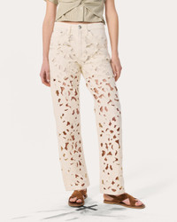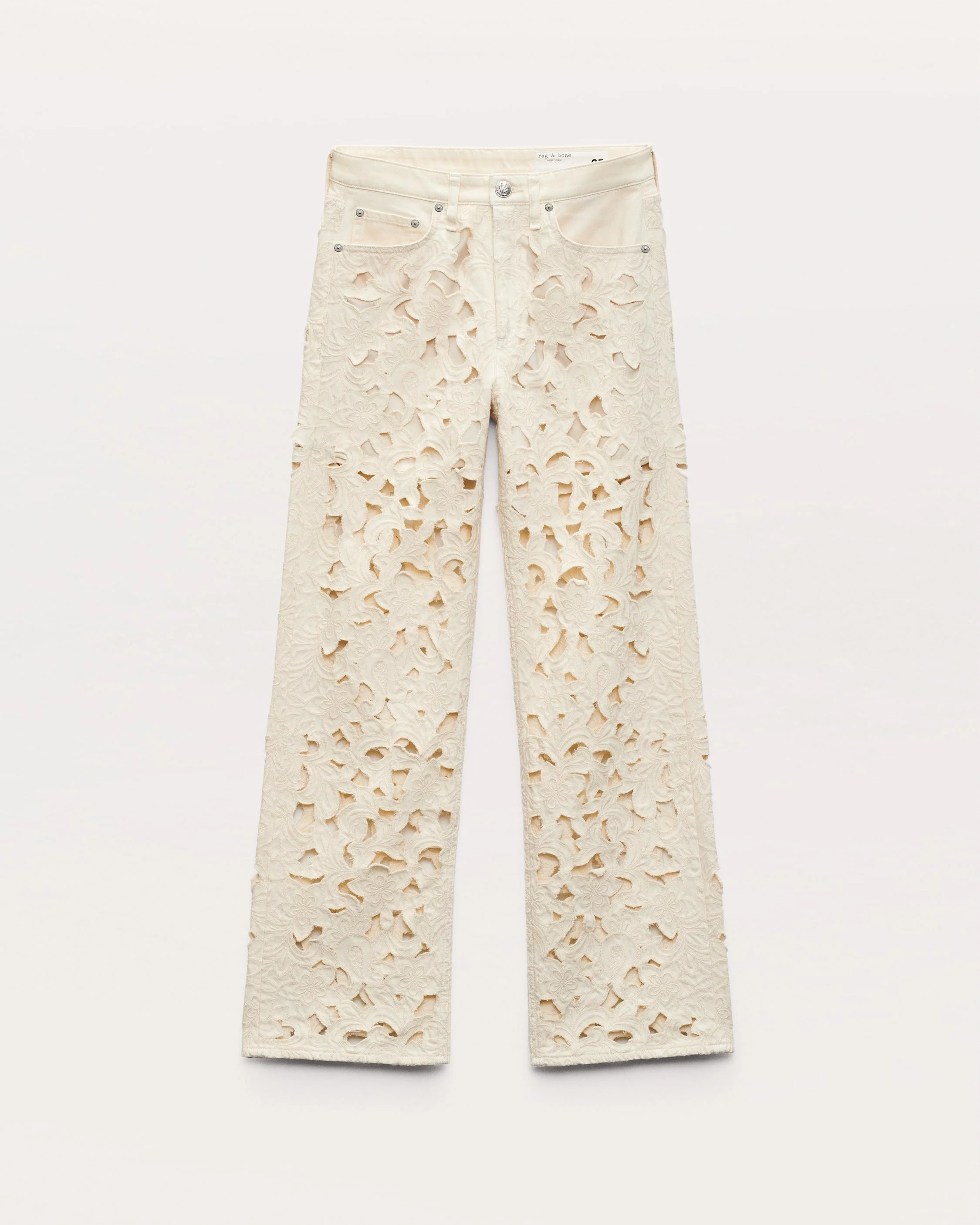 The Logan. Our laid-back, mid-rise jeans with a roomy fit through the hip and thigh. (Pro tip: Take your natural size and wear low on your waist for a relaxed look, or size down for a higher rise.) Crafted from Lightweight Rigid non-stretch denim that provides structure, but breaks in over time for a soft and comfortable feel. In Ecru Floral Cutout, a soft, warm white featuring floral embroideries and laser-cut details. Finished with a mini shorts-length lining. Size & Fit • Mid-rise • Relaxed wide, full-length leg • Size 26 : 11.5" front rise | 31.5" inseam | 20" leg opening • Model is 5'11" wearing size 25 Features & Details • 100% cotton • Lightweight Rigid Denim • In Ecru Floral Cutout, a soft, warm white featuring floral embroideries and laser-cut details • Zip fly with a button closure • Signature dagger tack buttons & washer rivets • Partially lined to the length of mini shorts • Five-pocket pant • Hand wash only • Imported Product ID: WDD25P1004RGEF