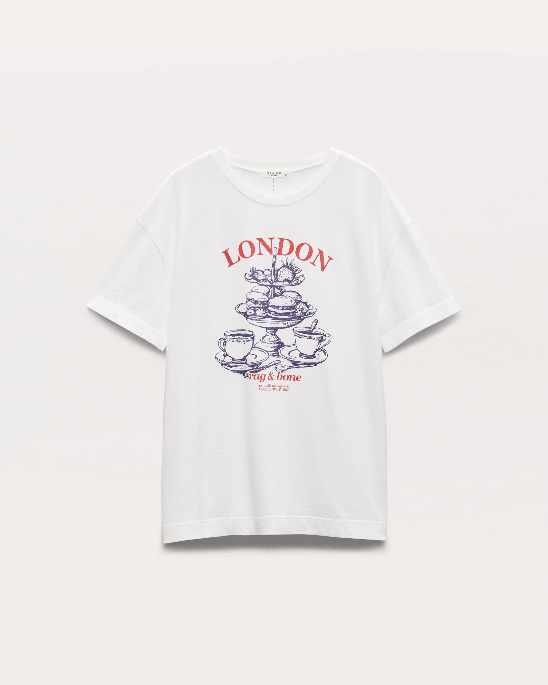 Afternoon delight. Like a wearable postcard from London, this laid-back, oversized tee turns a traditional high tea into an unexpected print illustrated by our in-house studio. It's cut from Peruvian cotton jersey that feels soft & smooth. Take your typical size for its intended looser look, or size down for a closer fit. Size & Fit • Oversized boyfriend tee • Fits large to size. Consider sizing down for a closer fit. • Size Small: body length 26.5" | chest 40.5" | sweep 41.5" | sleeve length 7" • Model is 5'11" wearing size small Features & Details • 100% cotton • Rb London graphic custom-illustrated by rag & bone studio • Machine wash cold on delicate & tumble dry low or dry clean • Made in Peru Product ID: WCC25PT027MI28
