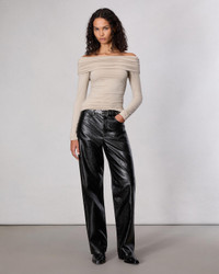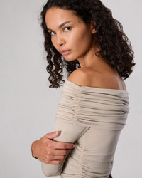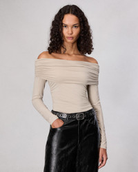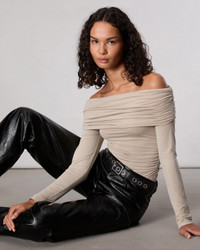 Made from a silky-soft stretch fabric, this shoulder-baring pullover is gathered and draped to achieve a figure-flattering slim fit. Size & Fit Slim fit Size Small: Back length 17", chest 27", sweep 28 1/2", sleeve length 21 1/4" Model is 5'9" wearing size S Features & Details 93% Modal 7% Spandex Machine wash cold, gentle cycle, do not bleach, lay flat to dry, low iron if needed, or dry clean Imported Product ID: WAC24HT024L924