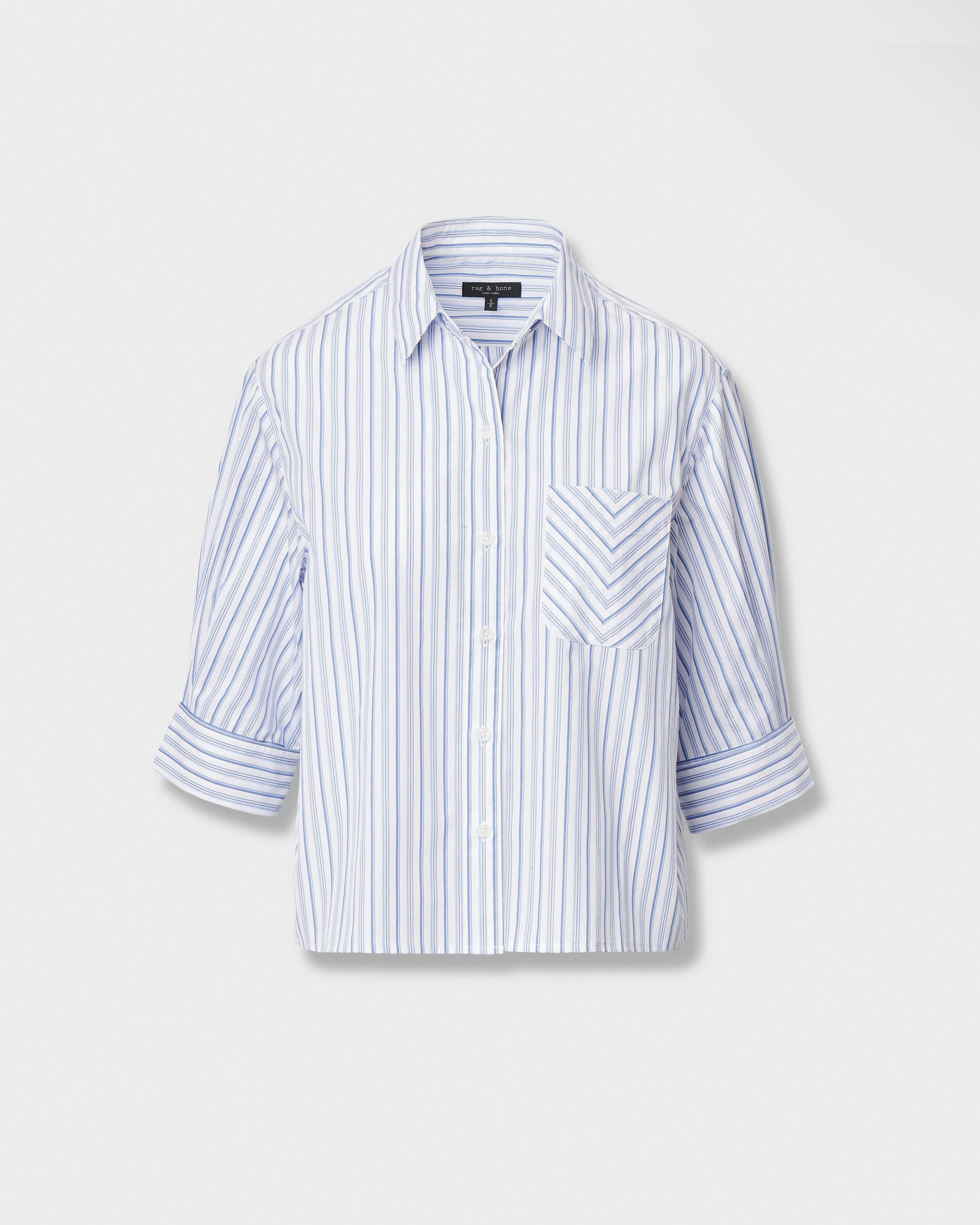 A fresh take on the striped button-up shirt. Tailored for a relaxed, slightly cropped fit from crisp cotton poplin. Finished with a chevron front pocket and tacked sleeves cuffed at the perfect length for a chic, flowy look. It's a new wardrobe staple that pairs well with anything, especially denim. Size & Fit • Boxy fit • Fits true to size • Size Small: Body length 23.25", chest 43.5", sweep 42.5", sleeve length 23" • Model is 5'9" wearing size small Features & Details • 100% cotton • Unlined • Center front button closure • Faux horn buttons • Chest patch pocket • Machine wash cold inside out & tumble dry low • Imported Product ID: RA6Y26SSMCO