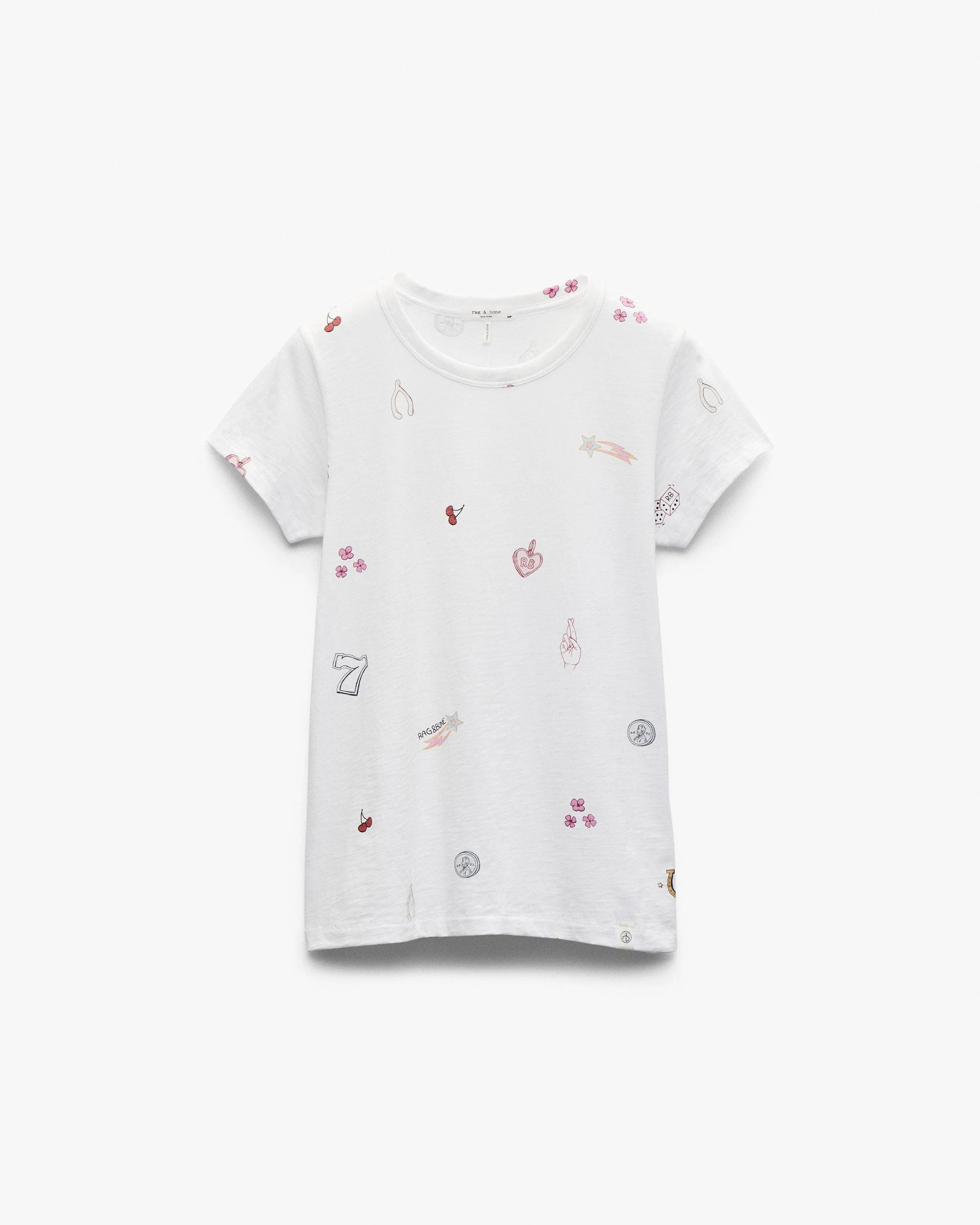 Written in the signs. Illustrated by our in-house studio, a lucky lineup of good-fortune graphics�from four-leaf clovers to crossed fingers and shooting stars�covers this crewneck T-shirt. It's cut for a classic fit from soft Peruvian cotton. Size & Fit • Classic fit • Fits true to size • Size Small: Body legnth 24.25", chest 33.5", sweep 34.5", sleeve length 12.25" • Model is 5'10" wearing size small Features & Details • 100% cotton • Machine wash cold on delicate & tumble dry low or dry clean • Made in Peru Product ID: RE5E25FT3SW