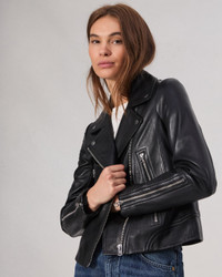 The perfect motorcycle jacket, crafted from hand waxed lamb leather with signature zipper and snap details. Size & Fit • Slim fit, signature moto jacket • Back length 20.5", chest 36.75", sleeve length 32" • Model is 5'9" wearing a size small Features & Details • 100% Lamb Leather • Front zipper closure • Zipper pocket • Professional leather clean only • Imported Product ID: WAW19F4047LP41