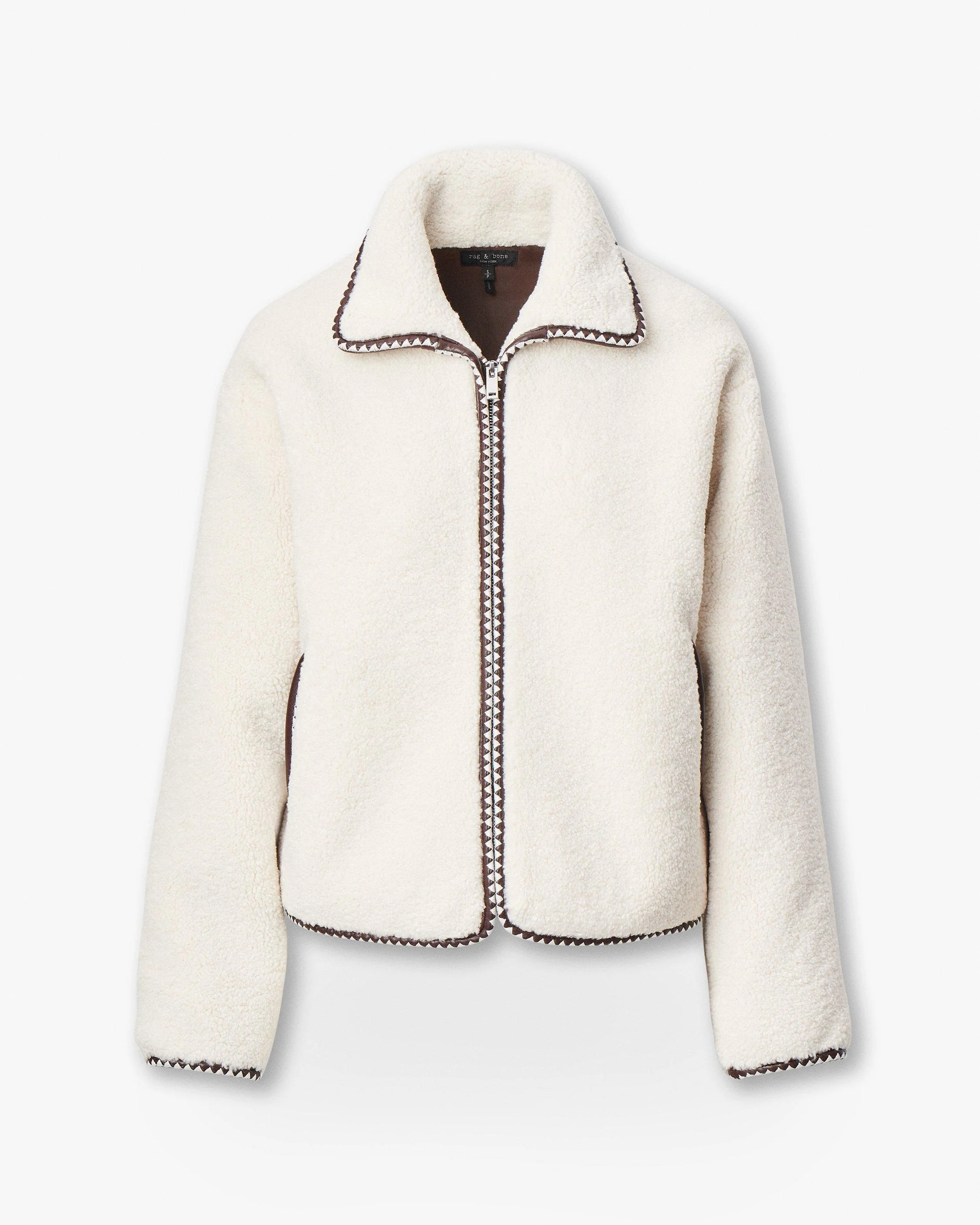 Plush comfort. Cut to fit like a bomber, this classic full-zip jacket combines lofty sherpa with contrast faux-leather binding featuring geometric whipstitching. Epitomizing cozy-chic for cooler days, it's a layer you'll want to throw on over denim or dresses. Size & Fit • Bomber jacket fit, hits above waist • Fits true to size • Size small: Body length 23.75", back length 22.75", chest 44", sleeve length 31.75" • Model is 5'9" wearing size small Features & Details • Body: 100% polyester • Lining: 55% polyester, 45% viscose • Trim: 100% polyester • Twill lining • Full-zip closure • Zipper at center front • Faux leather trim with ivory stitch • Two hip pockets • Dry clean only • Imported Product ID: RA4S25H0MOW