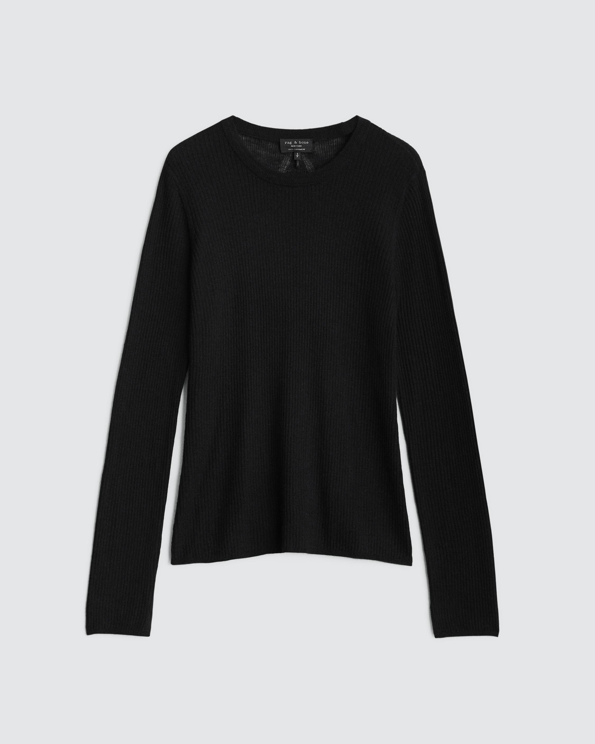 The Mandee. Your favorite ribbed T-Shirt, now in cashmere. Crafted in 100% lightweight cashmere with an ultra-soft ribbed knit. In Heather, a soft grey with a slim fit. Essential wearing (and pairing) with our Peyton jean. Size & Fit Slim fit Size Small: Body length 24 1/2", chest 33", sweep 34", sleeve length 26" Model is 5'9.5" wearing a size small Features & Details 100% Cashmere Dry clean only Imported Product ID: WAS23F052CS52