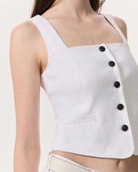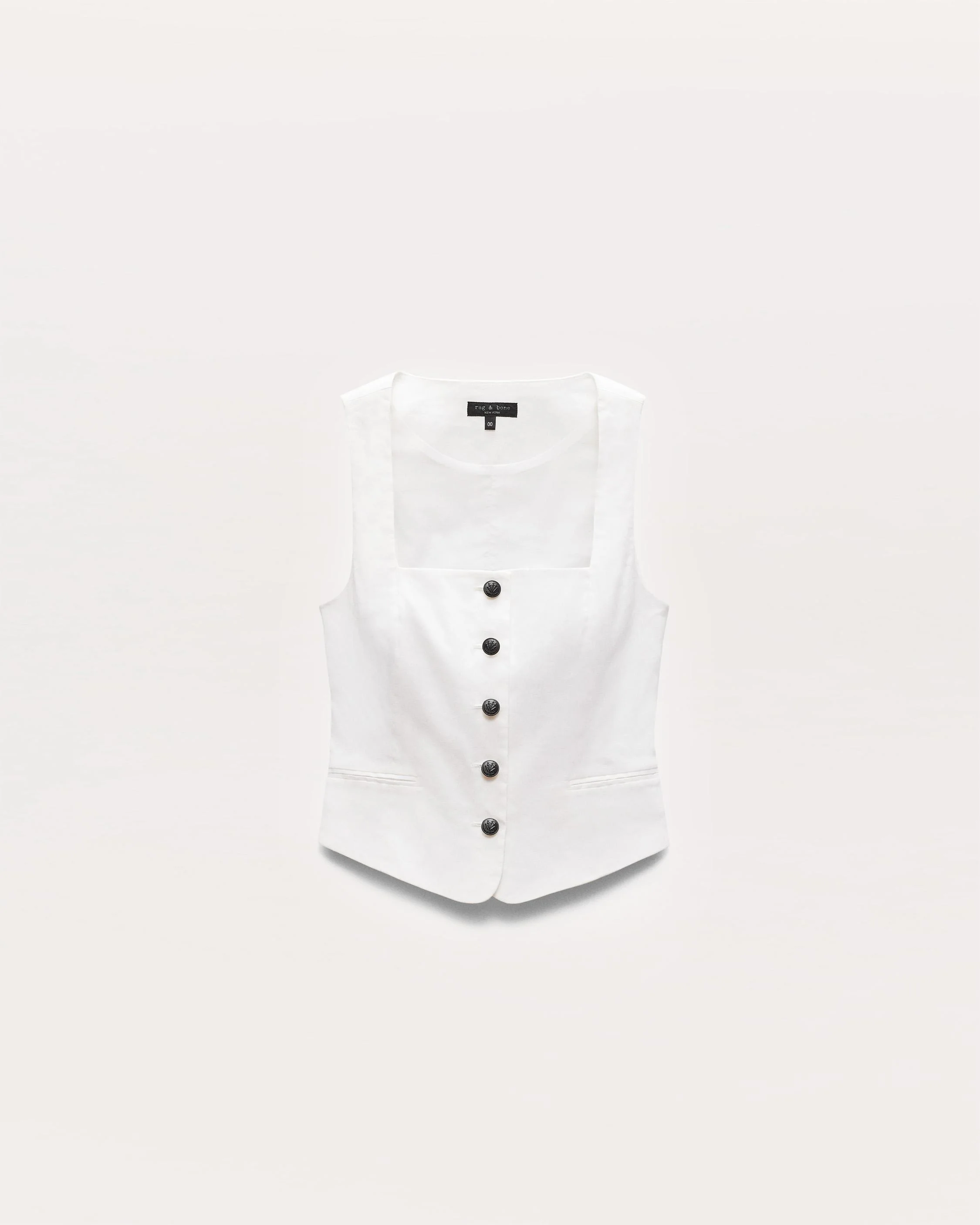 This slightly cropped square-neck vest is tailored for a slim fit from a lightweight linen blend with a touch of stretch. Metal-rimmed buttons create an elevated contrast. Size & Fit Slim fit Size 4: Front length 20 3/4", back length 19 1/4", chest 33" Model is 5'10.5" wearing size 2 Features & Details Body: 52% Linen, 46% Viscose, 2% Spandex Lining: 97% Rayon, 3% Spandex Dry clean only Center front button closure Hip besom pocket Imported Product ID: WAW25SA0277527