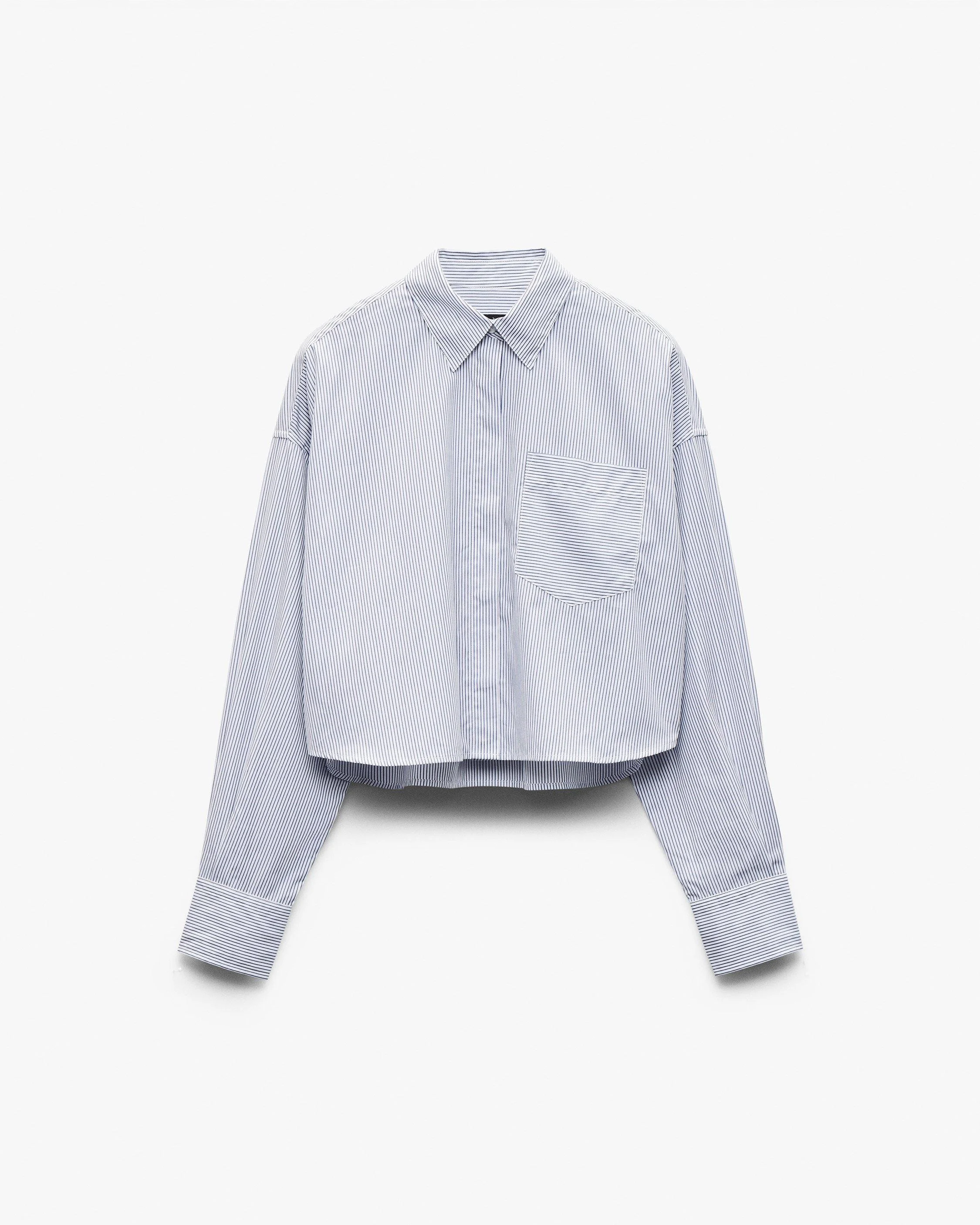 Not your basic button-up. A modern twist on your favorite striped shirt, cut from lightweight cotton poplin with a cropped, boxy silhouette made for now. Size & Fit • Cropped, boxy fit • Fits true to size • Size small: Back length 20.5", chest 54", sweep 53.5", sleeve length 32.75" • Model is 5'11" wearing size small Features & Details • 100% cotton • Machine wash warm & tumble dry medium • Embroidered rag & bone logo at cuff • Contrast thread color at bottom buttonhole • Unlined • Chest patch pocket • Imported Product ID: RA4M25FSMCO