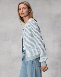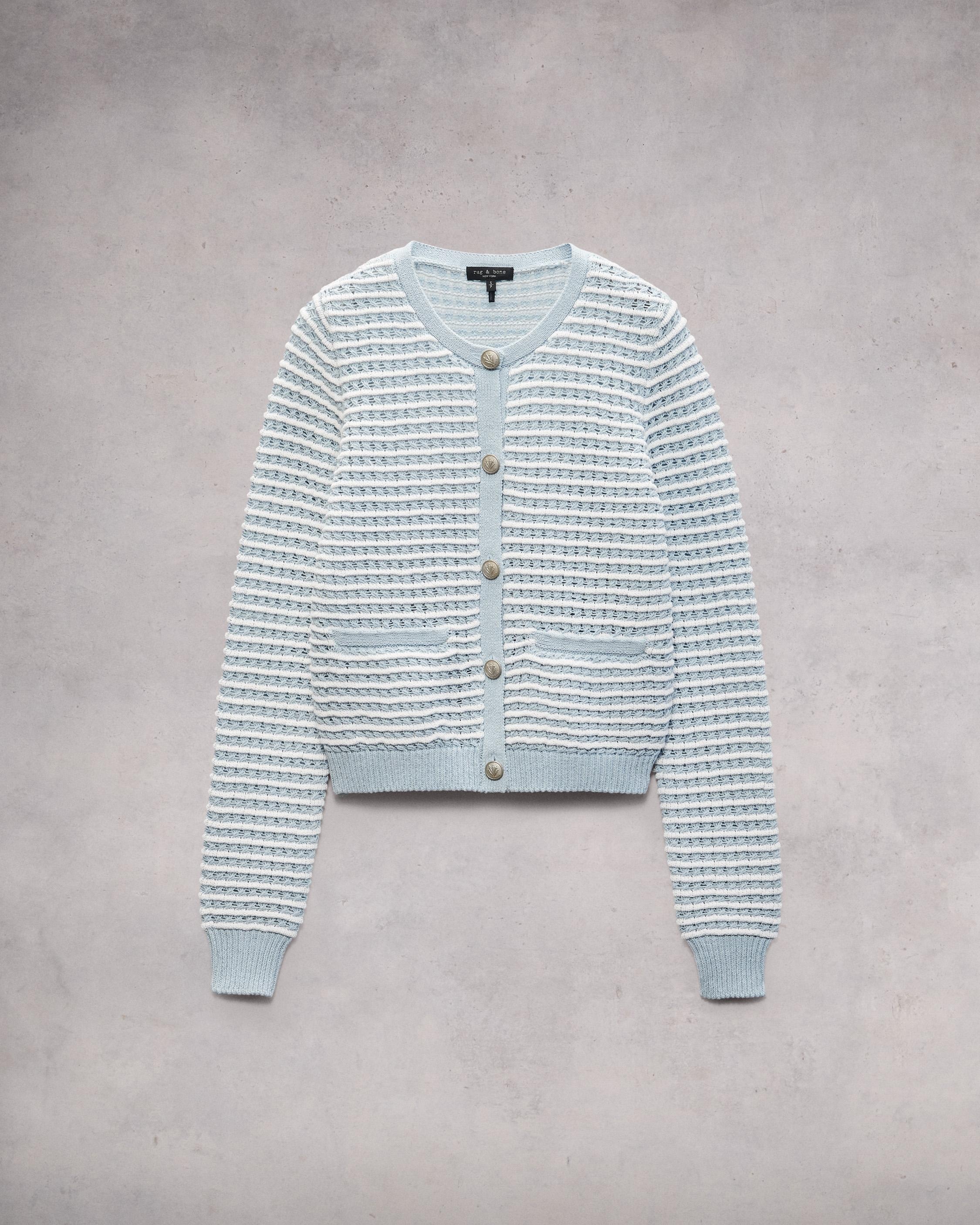The Marlee. Some things never go out of style. Punctuated with our signature dagger buttons, this relaxed cut cardigan is crafted in a striped ottoman cotton-blend knit with open stitch work for a breathable finish. Size & Fit Relaxed fit Size Small: body length 20", chest 35", sweep 29" , sleeve length 25" Model is 5'7.5" wearing a size small Features & Details 83% Cotton 17% Nylon Dry clean only Metal buttons Imported Product ID: WAS24P034SC34