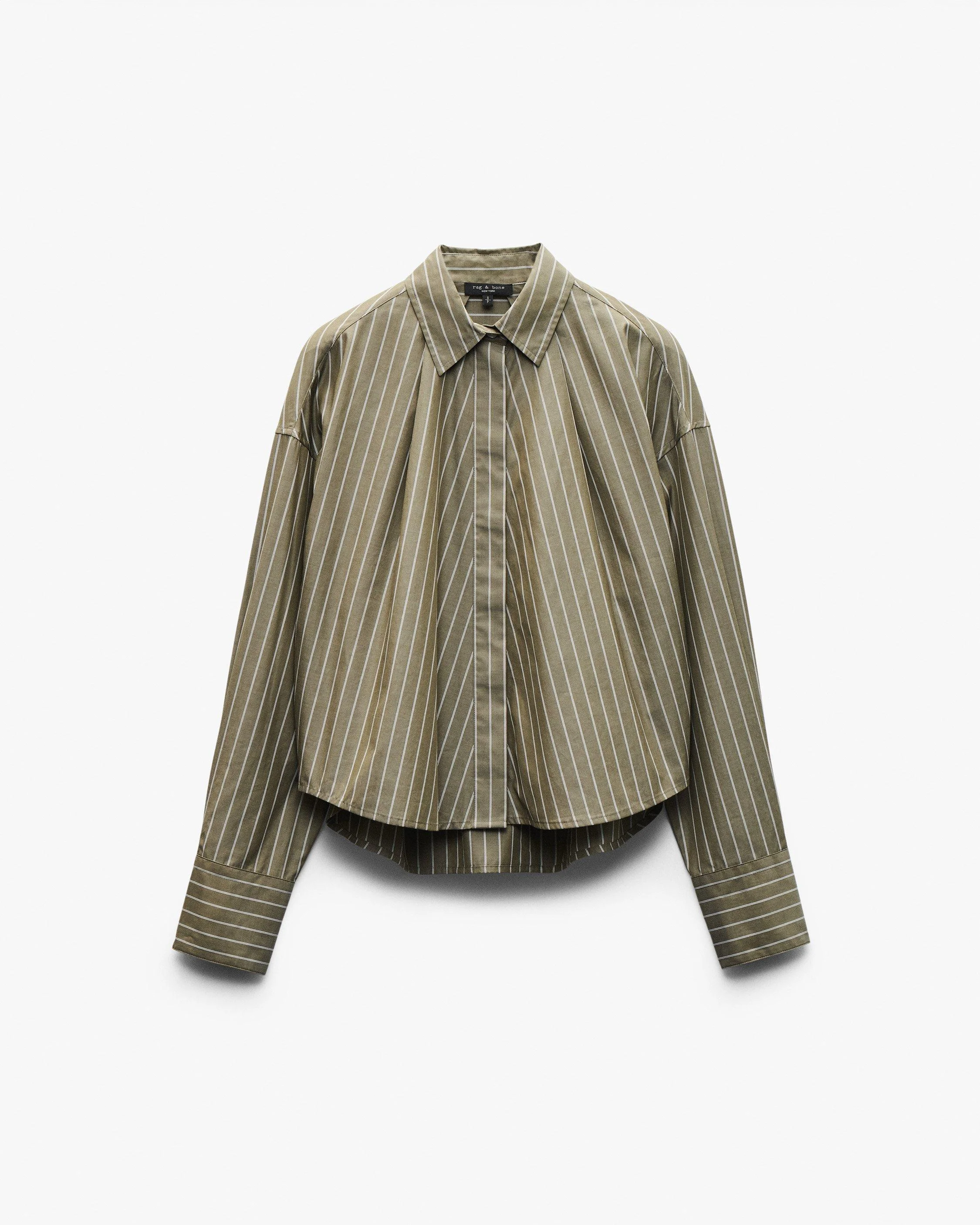 Fresh feel. Our best-selling cotton poplin shirt returns in an easygoing, long-sleeve silhouette. This crisp striped top is tailored for a flowing, boxy fit with a slightly cropped hem that hits just at the hip. Hidden buttons create a clean finish with a focus on the fabric. Size & Fit • Boxy fit • Fits true to size • Size small: Back length 24", chest 53.5", sweep 53", sleeve length 32.75" • Model is 5'9" wearing size small Features & Details • 100% cotton • Machine wash warm & tumble dry medium • Buttons at center front, sleeve cuffs and sleeve plackets • Unlined • Imported Product ID: RA8625FSMAC