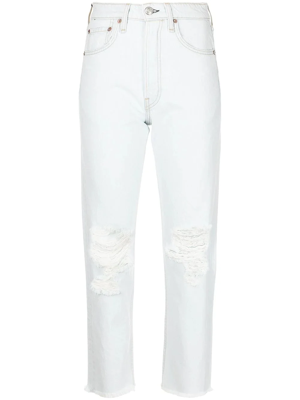 Maya high-rise slim-cut jeans ditch plains light blue cotton light wash distressed effect high waist slim cut front button and zip fastening classic five pockets Made in United States Composition Cotton 100% SIZE & FIT Model measurements Height 5 ft 10 in(1.77 m) Bust/Chest 33.85 in(86 cm) Hips 35.03 in(89 cm) Waist 24.01 in(61 cm) FittingInformation This piece fits true to size. We recommend you get your regular size Cut for a relaxed fit Made with a mid-weight non-stretch fabric Washing instructions Machine Wash