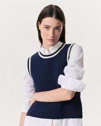 All aboard. Nautical-inspired crochet trims enhance the dimensional texture of this relaxed-fit sweater vest, which is knit from a lightweight yarn infused with breathable cotton and viscose. Size & Fit Relaxed fit vest Size Small: Body length 19", chest 34 1/2 ", sweep 33" Model is 5'10.5 wearing size small Features & Details 44% Cotton, 35% Nylon, 17% Viscose, 4% Polyester Dry clean only Imported Product ID: WAS25S039EC39