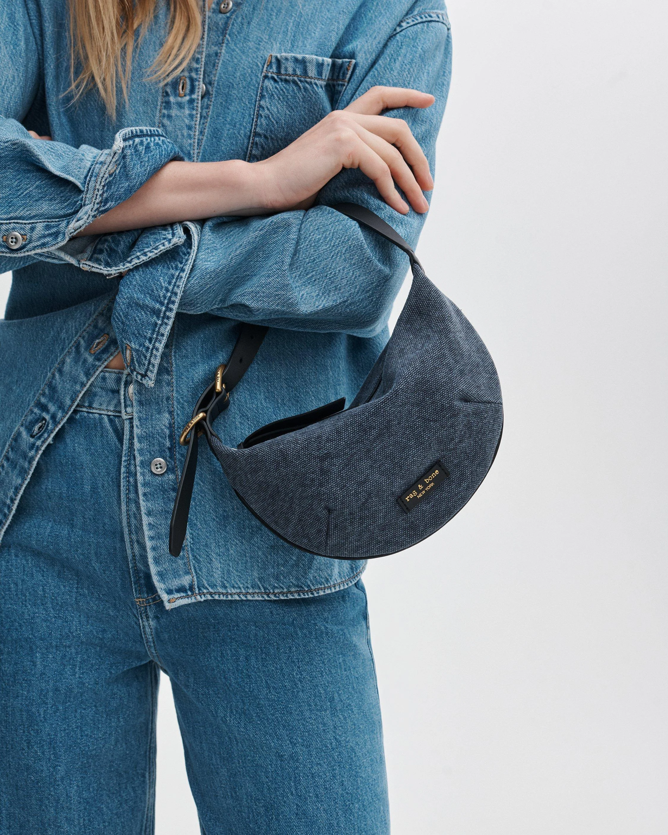 Our iconic hobo bag, reimagined. This sophisticated, smaller-scale interpretation streamlines the original design into a soft, sculptural curve crafted from denim-like Italian canvas. The adjustable handle lets you fine-tune how it hangs from the crook of your arm or close at hand. An interior slip pocket helps keep your items organized and easily accessible. Size & Fit • Dimensions: 9" x 1" x 6" • Handle drop: 7" Features & Details • Body: 100% canvas • Lining: 100% cotton • Strap and Trim: 100% leather • Top zip closure • Dust bag included • Professional leather clean only • Imported Product ID: CA100901