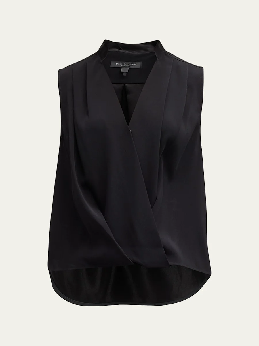 Rag amp; Bone "Meredith" satin tank top featuring a draped surplice front Slight stand collar V neckline Sleeveless Draped silhouette Highlow hem Front hook closure Triacetate Items runs large, consider ordering as size down Dry clean Imported