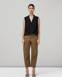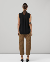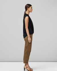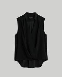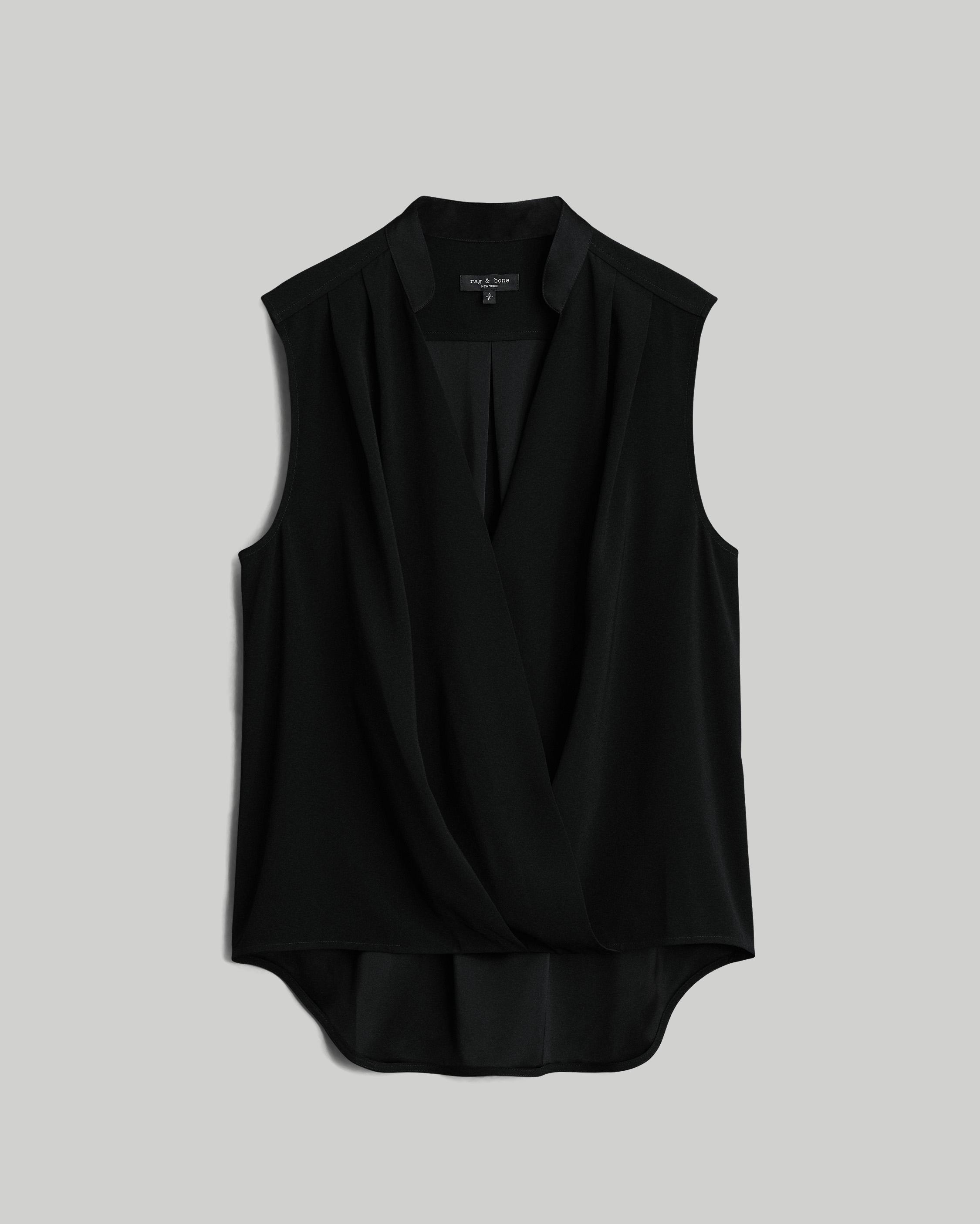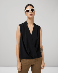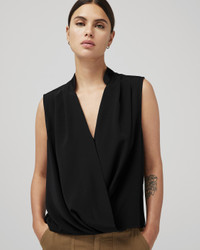 Introducing Meredith - our sleeveless draped blouse, perfect for any occasion. Crafted from a lustrous Japanese satin fabric, this top is complete with hidden a baby snap at the center front and a standing collar. Size & Fit Classic fit Size Small: Center back length from center back neck seam 26 3/4", back chest 20 3/4", sweep 42 1/2" Model is 5'10" wearing a size small Features & Details Self: 86% Triacetate 14% Polyester Combo: 100% Polyester Dry clean only Hidden baby snap at center front, shiny collar stand, combo binding Imported Product ID: WAW23SA0507550