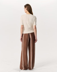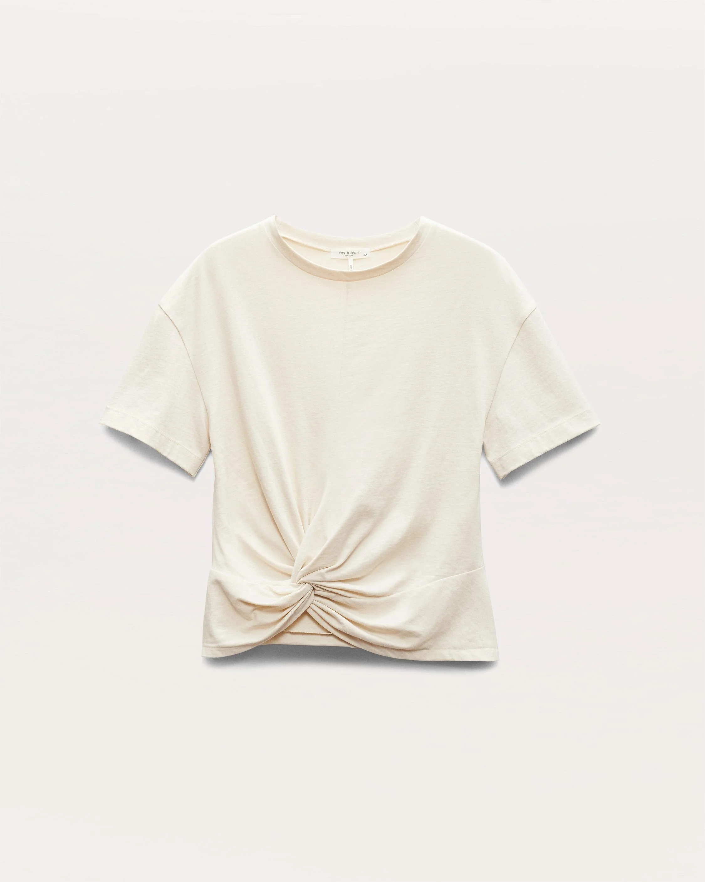 Cut with the perfect drape from super-soft Peruvian cotton, this short-sleeve T-shirt is finished with a feminine twist detail at the front for a fresh take on a classic tee. Size & Fit Relaxed fit draped tee Size Small: Back length 24 1/4", chest 34", sweep 29 1/2", sleeve length 6 1/4" Model is 5'10" wearing size small Features & Details 100% Cotton Machine wash cold, gentle cycle, do not bleach, tumble dry low, low iron if needed or dry clean Draping detail at front hem Made in Peru Product ID: WCC25ST015MC17